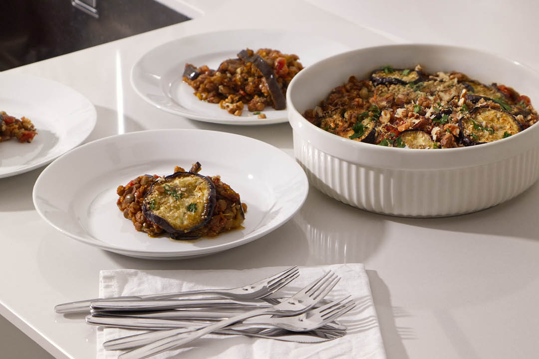 6. Kokoa vuoka levittämällä uunivuoan pohjalle ensin kerros munakoisoviipaleita ja sitten linssi-tomaattikastiketta. Toista, kunnes kaikki ainekset on käytetty.