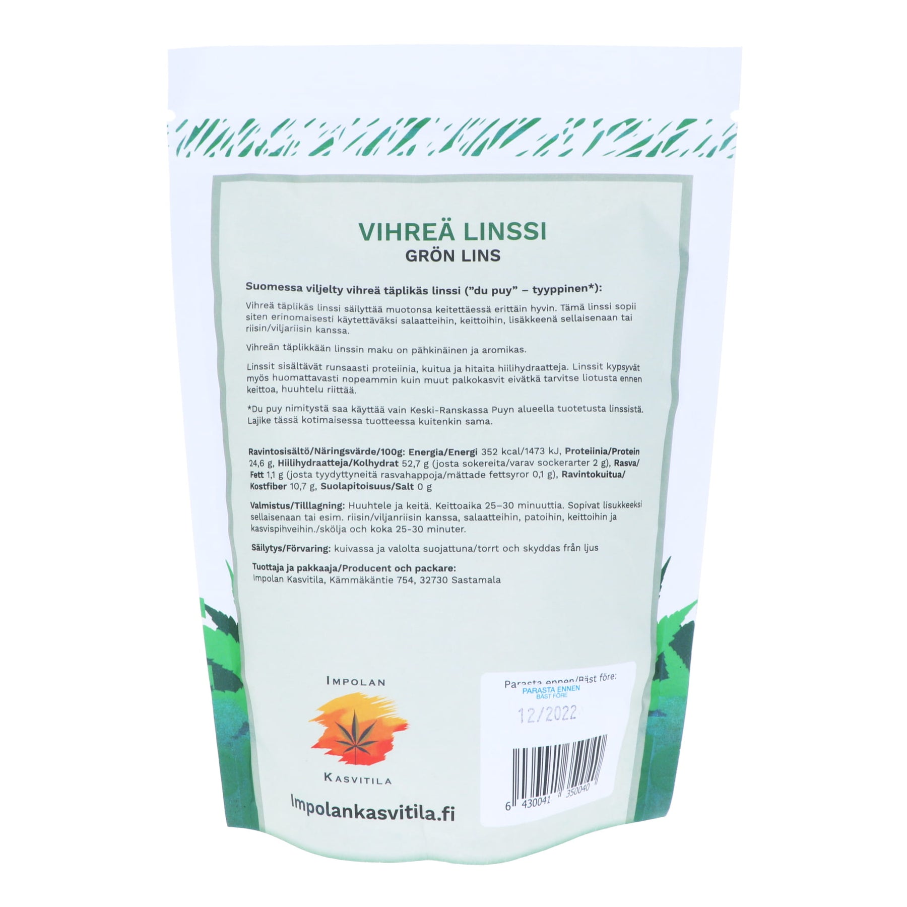 "Kotimaiset linssit - never heard? No nyt kuulet! Nämä Impolan kasvitilan Suomessa viljelemät vihreät linssit ovat todellista lähiruokaa, ja maku on mehevä ja maukas. Paljon proteiinia ja kuituja sisältävät vihreät linssit ovet lemppareitani salaatteihin, keittoihin, lisukkeeksi, sellaisenaan tai ihan kaikkeen ruoanlaittoon. Tämän pussin ostamalla tuet toden teolla kotimaista ruoantuotantoa ja pienyrittäjyyttä. Suosittelen!"
