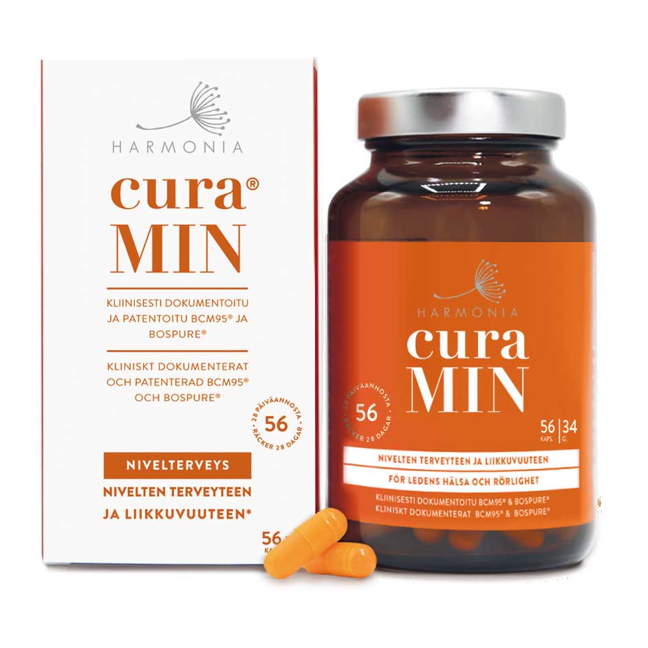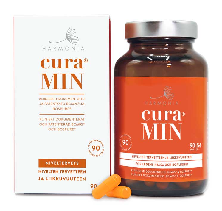 Harmonia curaMIN® -nivelvalmisteessa vaikuttaa maailman dokumentoiduin BCM95-kurkumiiniuute, joka auttaa suojaamaan niveliä ja tukemaan normaalia nivelterveyttä ja Bospure-boswelliauute, joka tukee nivelten liikkuvuutta ja mukavuutta.