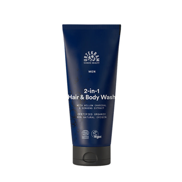 Urtekram Men Hair Body Wash 2-in-1 Hair & Body sisältää energisoivaa Ginseng-uutetta ja luomupajuhiiltä tuoksuen raikkaan maskuliiniselle.
