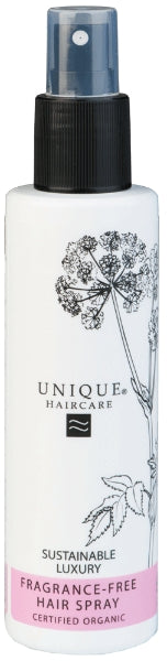 Aerosoliton ja hajusteeton muotoilusuihke antaa hiuksille rakennetta ja kampaukseen pysyvyyttä. Ei varise. Käyttöohje: Suihkuta noin 10 cm etäisyydeltä suoraan hiuksiin tai ensin kämmenelle ja muotoile sormin. Ravistele hyvin ennen käyttöä ja huuhtele suihkekärki silloin tällöin lämpimällä vedellä käytön jälkeen. Unique Haircare Tanskalaisen Unique-sarjan tuotteiden tärkein valmistusaine on paljon vitamiineja, proteiineja ja mineraaleja sisältävä luomuhera, joka vahvistaa, suojaa ja elvyttää hiusta pintaa syvemmältä. Lisäksi tuotteet sisältävät luonnonkukista ja kasveista peräisin olevia hoitavia uutteita ja öljyjä. Tuotteissa käytetyt pintakäsittelyaineet perustuvat uusiutuviin luonnonvaroihin kuten pohjoismaiset kukat, kasvit ja vilja. Sarjan tuotannossa hyödynnetään mietoja, ympäristöystävällisiä ja luonnollista alkuperää olevia puhdistusaineita, kasvipohjaisia emulgointiaineita, luomusertifioituja hydrosoleja, luomusertifioituja kasviöljyjä ja luomumaitoa. Säilöntäaineet ovat mietoja ja tuotteet sisältävät luomusertifioituja eteerisiä öljyjä ja sertifioituja reilun kaupan valmistusaineita. Kaikki tuotteet on valmistettu tuulienergiaa hyväksi käyttäen. Unique tuotteissa ei käytetä parabeeneja, propylenglykolia, PABA-aurinkofilttereitä, synteettisiä värejä tai hajusteita, nano-ainesosia, geenimuunneltuja aineita, formaldehydejä eikä niiden johdannaisia, myrkyllisiä kemikaaleja, lanoliinia, SLS/SLES:tä, trethanolamiinia (TEA), EDTA, ureaa. Tuotteita ei ole testattu eläimillä. Unique hiusten- ja ihonhoitotuotteilla on seuraavat sertifioinnit: ECOCERT (luomu), CRUELTY FREE INTERNATIONAL (eläinkokeettomuus), TRE-FOR 100 % (tuulienergia). Unique on kansainvälisten Cosmoprof- kauneusmessujen Cosmoprof Green Prize voittaja. Pakkauksissa ilmoitetaan selkeästi eri sertifiointien osuudet tuotteesta.