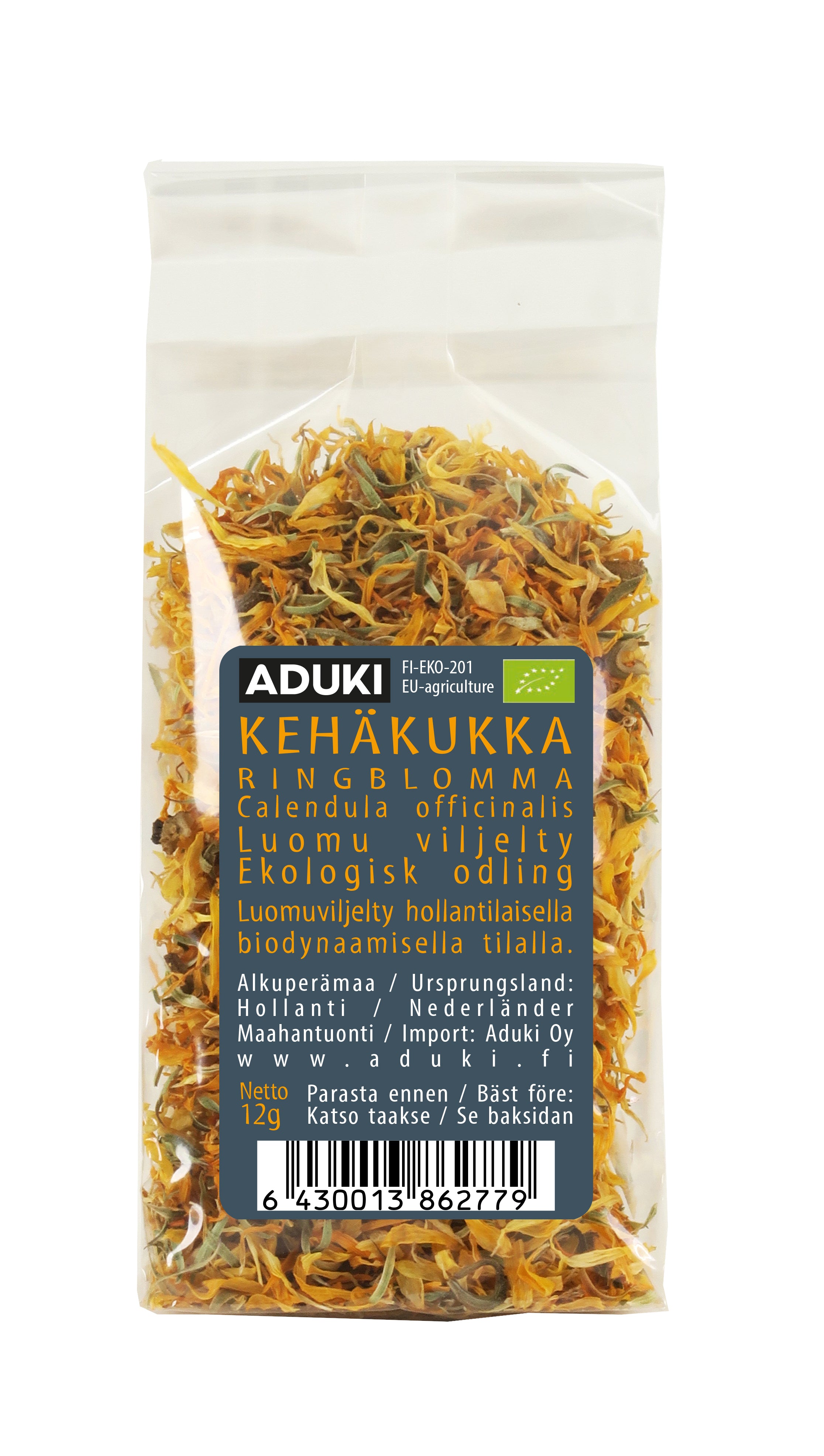 Aduki, Kehäkukka, 12 g. Kuivattu luomukehäkukka ilahduttaa paitsi ilkamoivalla värillä ja hienolla tuoksullaan, myös hyvää tekevillä vaikutuksillaan!