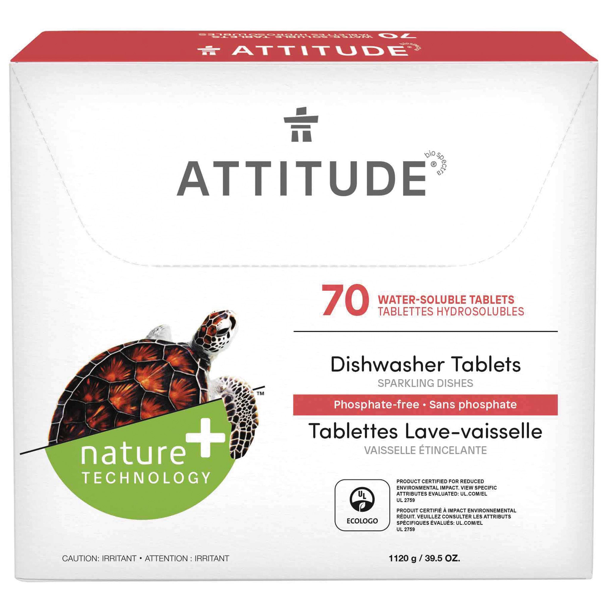 Attituden tuoksuttomat konetiskitabletit astioiden tehokkaaseen puhdistukseen. Fosfaatittomat tabletit jättävät astiat kiiltävän puhtaiksi ilman pesuainejäämiä, jälkiä tai huolta aiheuttavia ainesosia. Konetiskitabletin koostumus auttaa ehkäisemään kalkin muodostumista astianpesukoneeseen, pidentäen täten sen käyttöikää. Tablettien päällä vesiliukoinen suojakalvo. Pakattu kierrätysmateriaalista valmistettuun kartonkipakkaukseen.