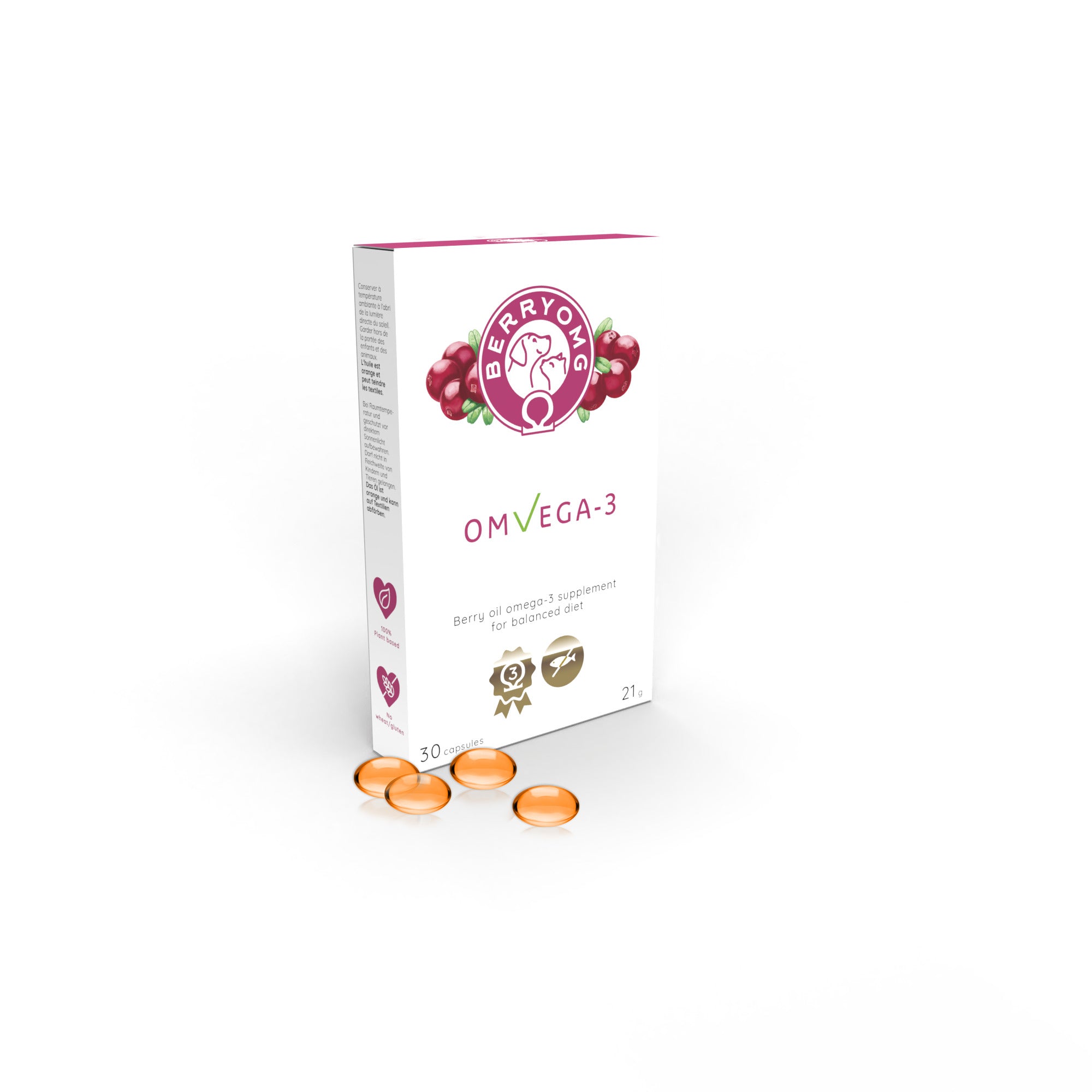 BERRYOMG OMvEGA-3 on innovatiivinen, kasvipohjainen omega-3-ravintolisä koirille ja kissoille, joka tarjoaa tärkeät rasvahapot ilman kalaa. Tuote on valmistettu pohjoisen puhtaassa luonnossa kasvaneista puolukoista, joiden siemenistä saadaan luontaisesti runsaasti omega-3-rasvahappoja ja antioksidantteja.