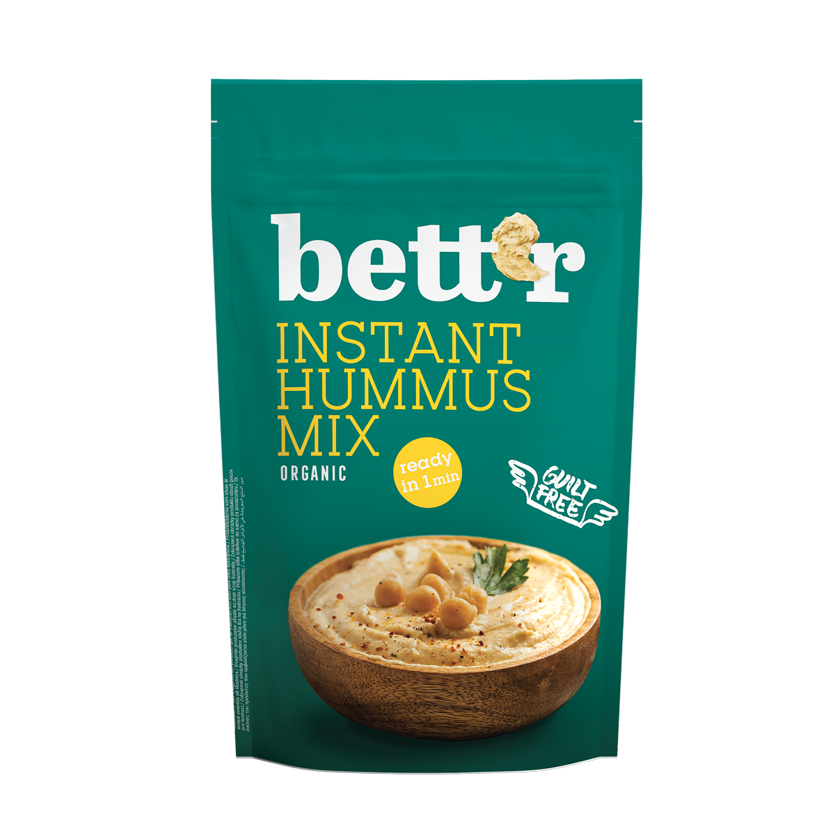 Hummusjauhe on kiireisen herkuttelijan paras kaveri! Bett'r luomuhummusjauheella valmistat nimittäin aivan ihanan maukasta ja täyteläistä hummusta todella helposti. Lisää vain vesi, oliiviöljy ja tilkkanen sitruunamehua ja saat valmista hummusta minuutissa!
