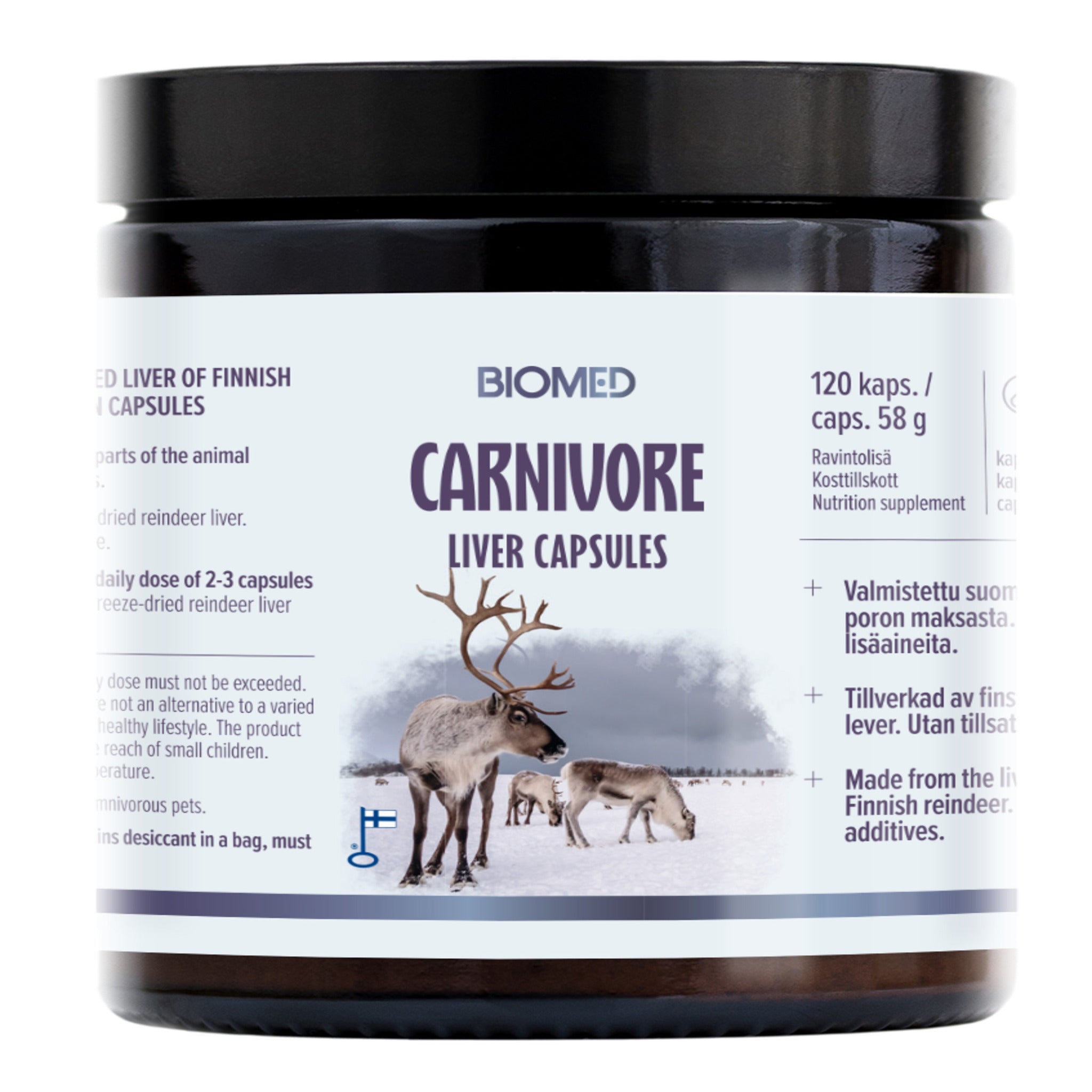 Pakastekuivattu poron maksa. Kapselin kuori: gelatiini.