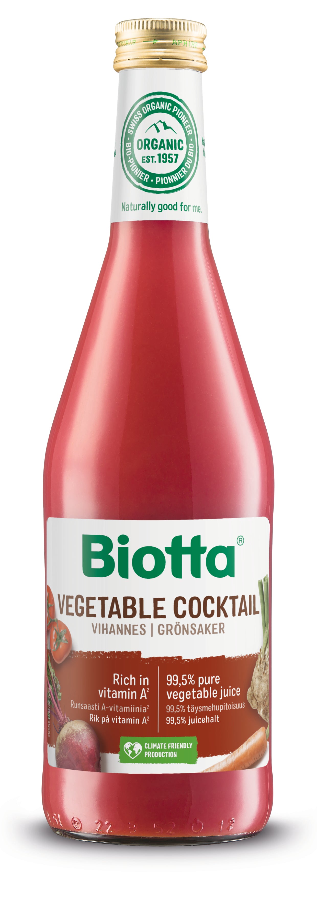 Tomatsaft *, mjölksyramorot- *, mjölksyraselleri- * och mjölksyrarödbetasaft *, havssalt (0,5%), örter *.