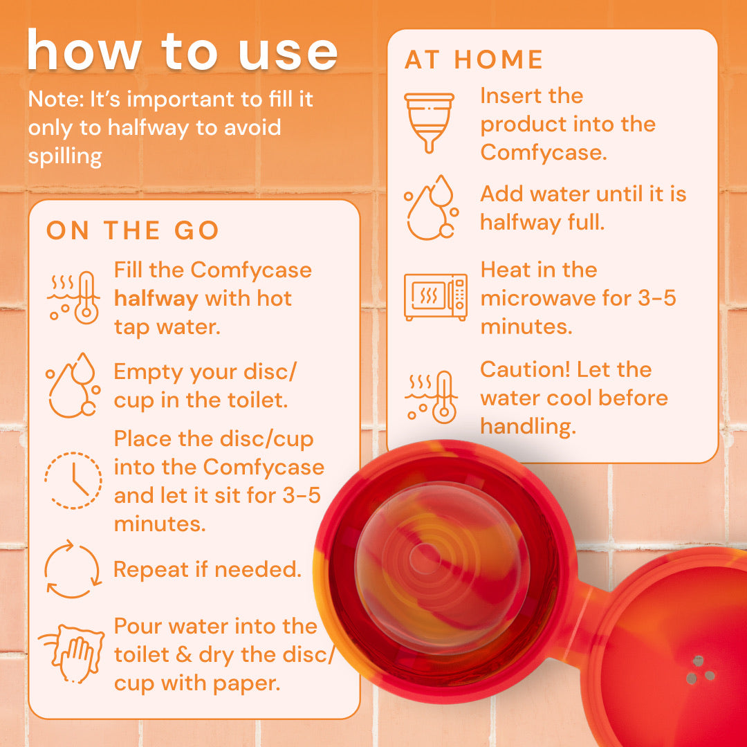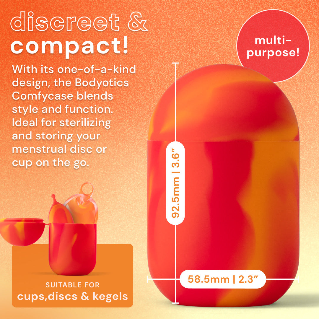 Bodyotics Comfycase on kuukautislevyjen ja kuukuppien pesukotelo, joka auttaa kuukautisten hoidossa julkisilla paikoilla. Voit pestä kuukautislevysi ja kuppisi kätevästi julkisissa vessoissa comfycase pesu & kantokotelossa. Comfycase pesukotelon kannessa on reiät joista kuuma ilma pääsee poistumaan. Valmistettu elintarviketason silikonista.