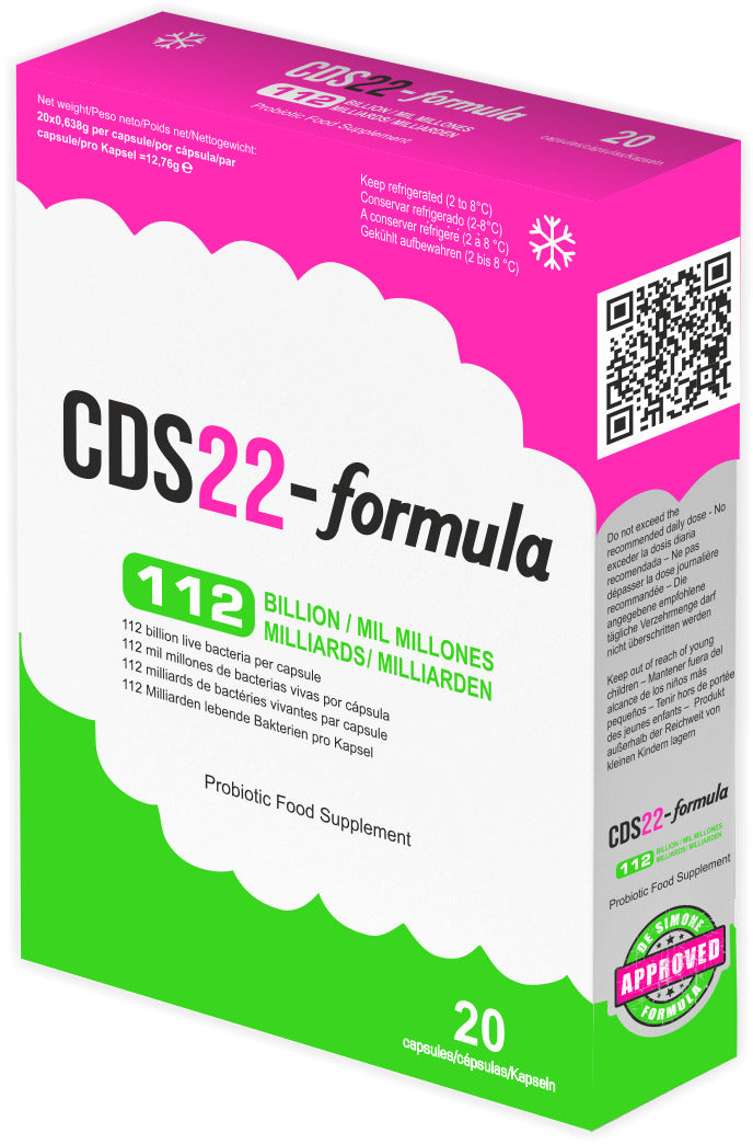 CDS22-formula 112B erottuu edukseen paitsi poikkeuksellisen bakteerimääränsä, myös tutkitun tehokkuutensa ansiosta. Valmiste perustuu professori Claudio De Simonen kehittämään alkuperäiseen reseptiin, joka on tulosta vuosikymmenten mittaisesta tutkimus- ja kehitystyöstä. Jokainen valmistuserä käy läpi tarkan laadunvalvonnan, jotta bakteerikannat säilyttävät elinvoimansa ja tehonsa aina käyttöhetkeen asti.
