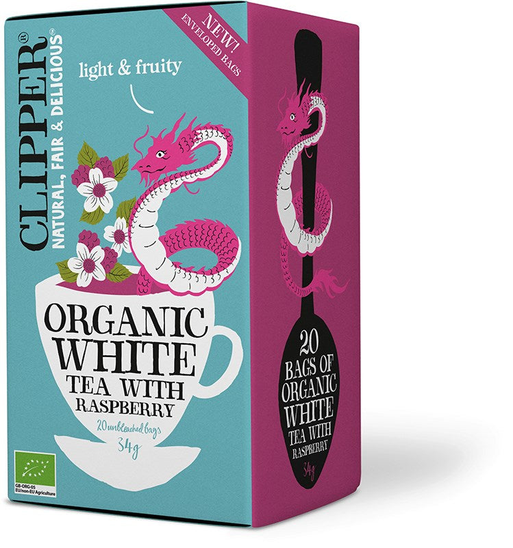 Valkoinen luomutee maustettuna maistuvan marjaisella vadelmalla.