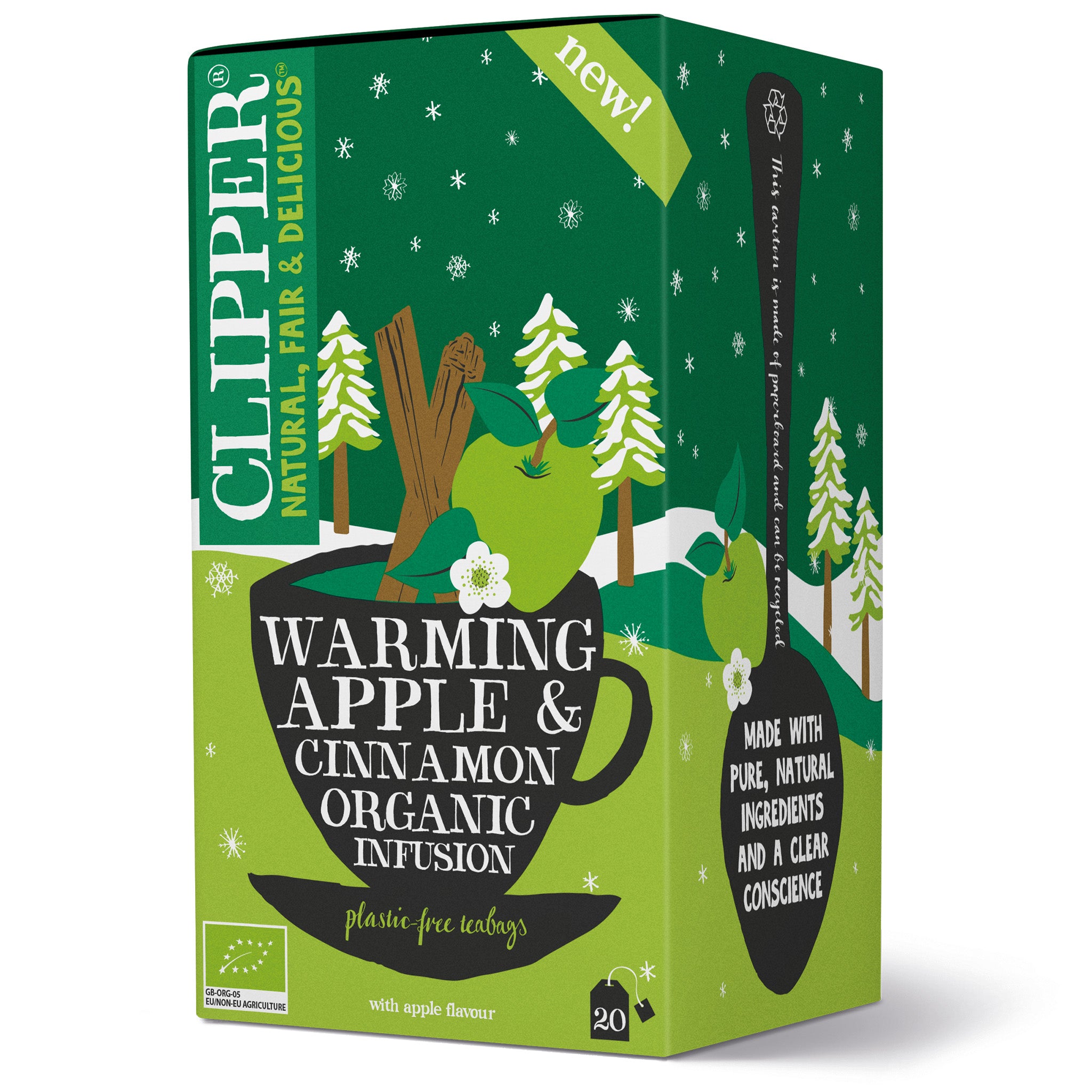 Herkullisen talvinen luomuhauduke, jossa yhdistyvät ihastuttavat omenapiirakasta tutut kaneli ja omena. Hauduke on puhtaista luonnollisista raaka-aineista eikä niihin lisätä mitään keinotekoista. Muoviton ja kierrätettävä pakkaus sisältää 20 yksittäispakattua, valkaisematonta ja biohajoavaa teepussia.