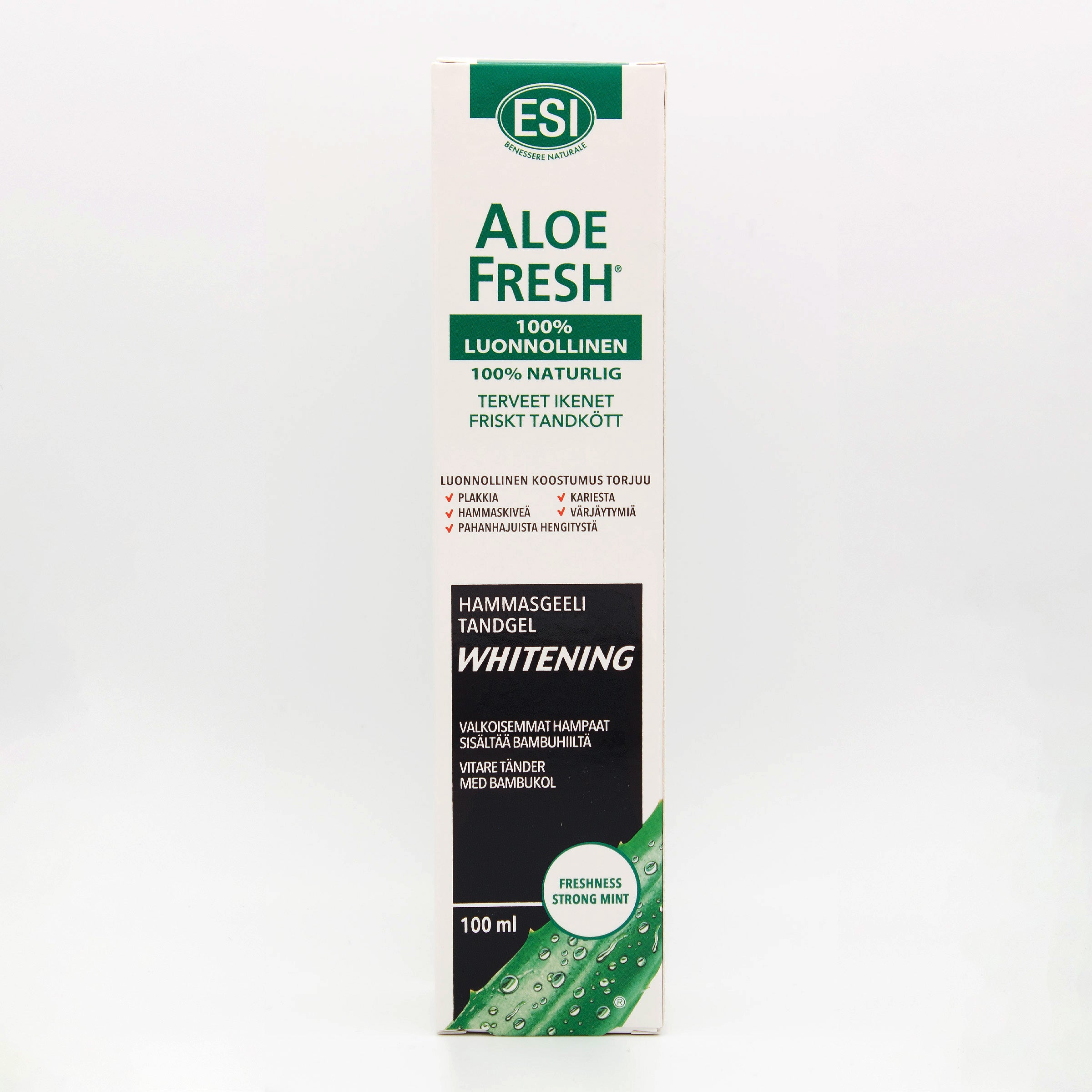 ESI Aloe Fresh Whitening on fluoriton bambuhiiltä sisältävä hammasgeeli, joka ehkäisee tummentumien syntymistä.
