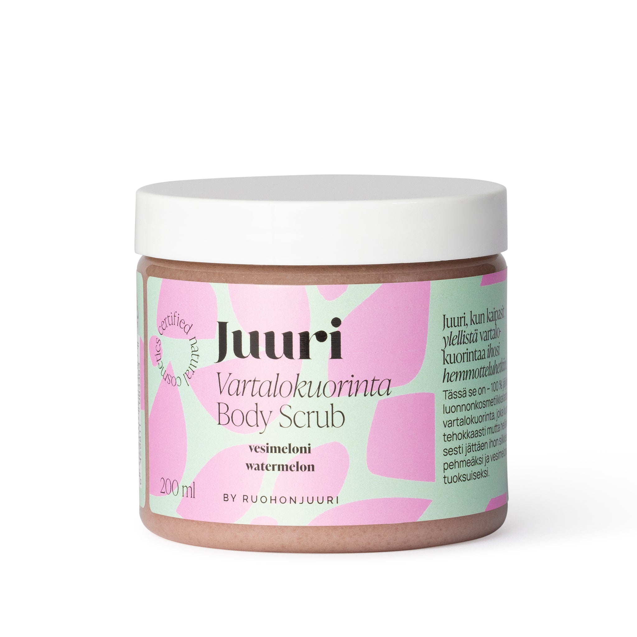 Juuri, kun kaipasit ylellistä vartalokuorintaa ihosi hemmotteluhetkiin. Juuri Vartalokuorinta saa aikaan silkkisen pehmeän ihon ja ihastuttaa täyteläisellä koostumuksellaan sekä raikkaan vesimelonin tuoksullaan - sopii normaalille ja kuivalle iholle.