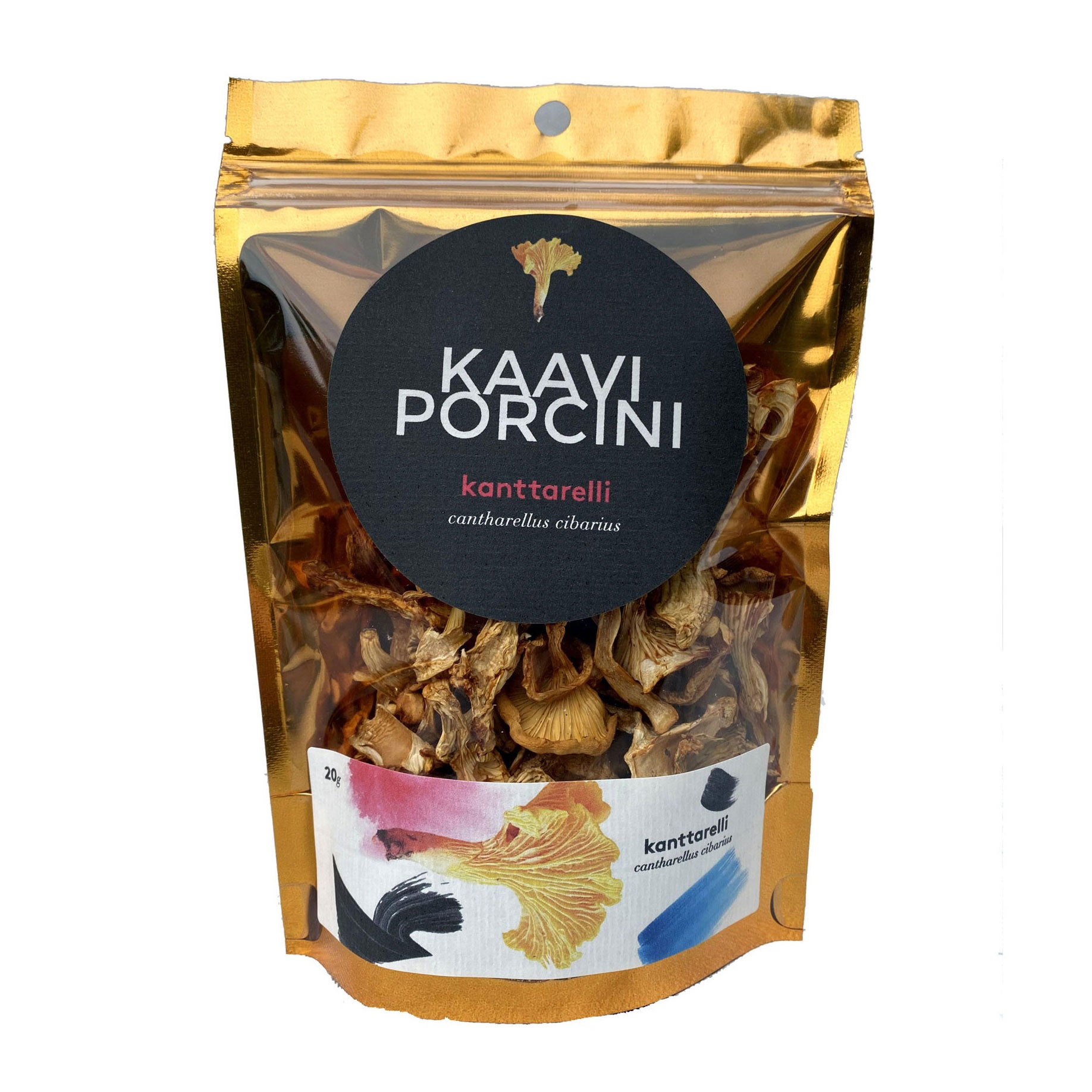 Kanttarelli ( cantharellus cibarius ) on kuivattuna varsin näppärä keittiökumppani, josta loihdit käden käänteessä hehkeimmät herkut koko perheen makuun! Kanttarelli on satoisa sieni, joka ilmestyy jo keskikesällä metsiimme. Kullan keltainen sieni vain paranee kuivurissa, väri ja aromi syvenevät. Kuivatut kanttarellit purkitetaan ilmatiiviiseen lasipurkkiin, nettosisältö on 20 g. Tähän 20 g käytetään 200 g tuoreita sieniä. Tämän tuotteen takana taiteilevan Kaavi Porcinin missiona on tuoda tämän metsiemme jaloimmat sieniaarteet jokaisen ulottuville, jokaiseen suomalaiseen keittiöön. Kaavi Porcinissa ollaan vakuuttuneita siitä, että Suomen metsistä löytyvät maailman parhaat villiruoka-aineet. Kaavin Herkkutattitehdas Oy toimii Kaavilla keskellä puhtaita suomalaisia metsiä. Tuotannossansa käytetään metsästä kerättyjä herkkutatteja, kantarelleja, mustatorvisieniä ja suppilovahveroita. Kaavi Porcinin sienet kasvavat Pohjois-Savon ja Pohjois-Karjalan erämaissa, keskellä jääkauden jättämiä harjuja ja puhdasta luontoa seuraanaan karhut ja sudet. Ruokasienet kuivataan modernissa tehtaassa. On aika uskomatonta, miten Kaavi Porcinin sienet tuovat aidon tuoreuden keittiöösi. Salaisuutena on, että sienet kuivataan oitis poimintapäivänä. Kaavi Porcinille tuoreus ja laatu on tärkeitä asioita ja he valvovatkin tarkkoina sienen matkaa metsästä kuivuriin ja sieltä edelleen ilmatiiviisiin lasipurkkeihin. Kaavi Porcinissa kaikki perustuu laatuun - jonka maistat taatusti!