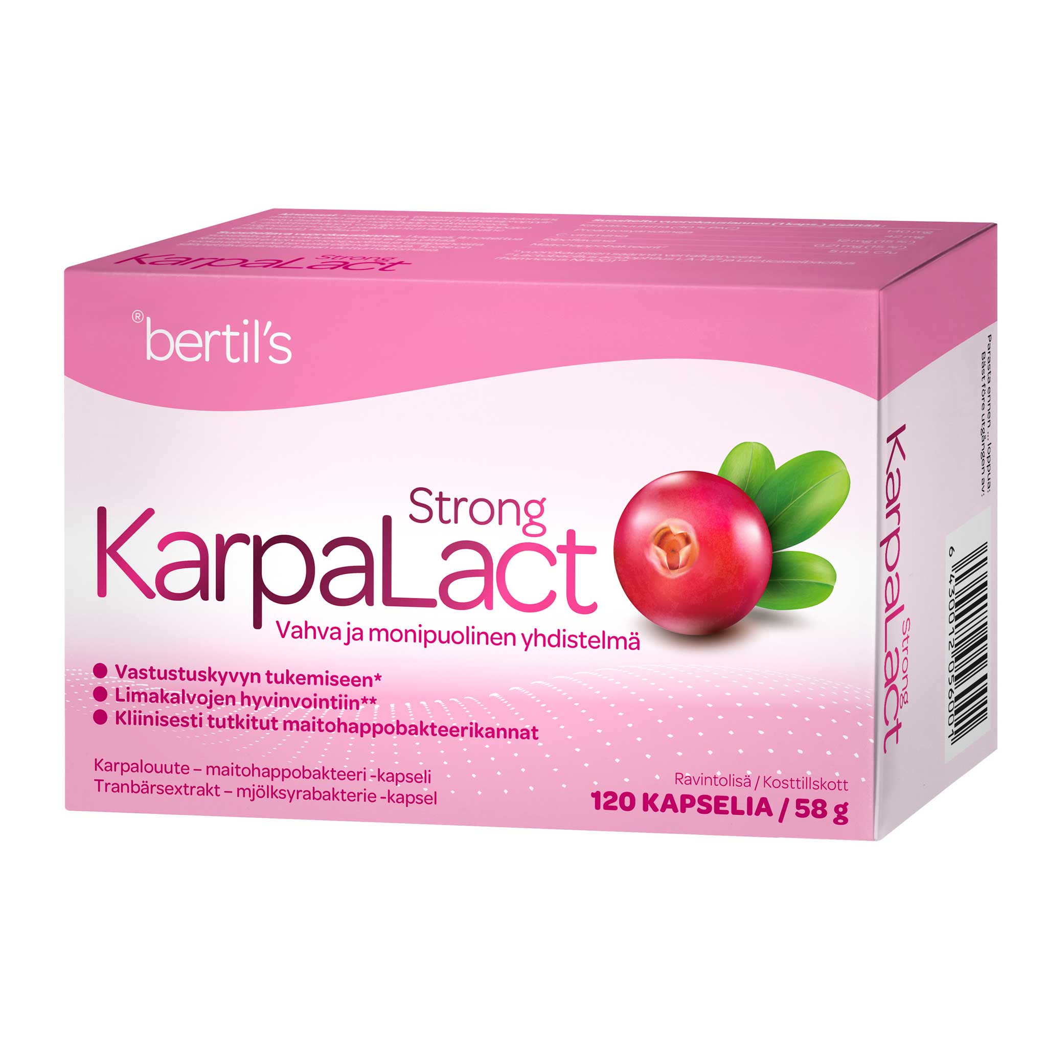 KarpaLact Strong on erityisesti naisten hyvinvoinnin asialla. Vahvan karpalon lisäksi se sisältää maitohappobakteereja, riboflaviinia sekä C-vitamiinia.