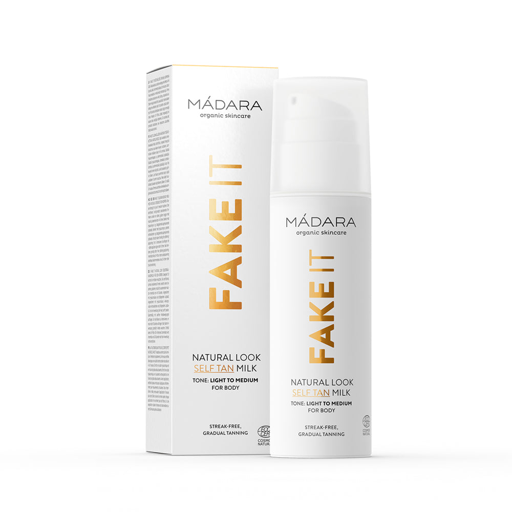 Madara-sarjan Itseruskettava voide (FAKE IT) on sertifioitua luonnonkosmetiikkaa - tottakai! Ylellisen tuntuinen, tosella toimiva itseruskettava voide jättää iholle kompromissittoman rusketuksen. Maitomainen koostumuksena ansiosta Madara-sarjan Fake-voidetta on helppoa levittää iholle — luonnollisen näköinen, hehkuvan kaunis päivetys kehittyy 4-6 tunnissa, ilman laikkuja. Rusketus syventyy jokaisella levityskerralla, tehden tuotteesta täydellisen niin vaaleille kuin medium-ihonsävyille. Valkoinen koostumus ei tahraa vaatteita tai lakanoita. Tuote sisältää kosteuttavaa hyaluronihappoa ja jojobaa. Aurinkoinen, raikas tuoksu - testaa ja ihastu itsekin!