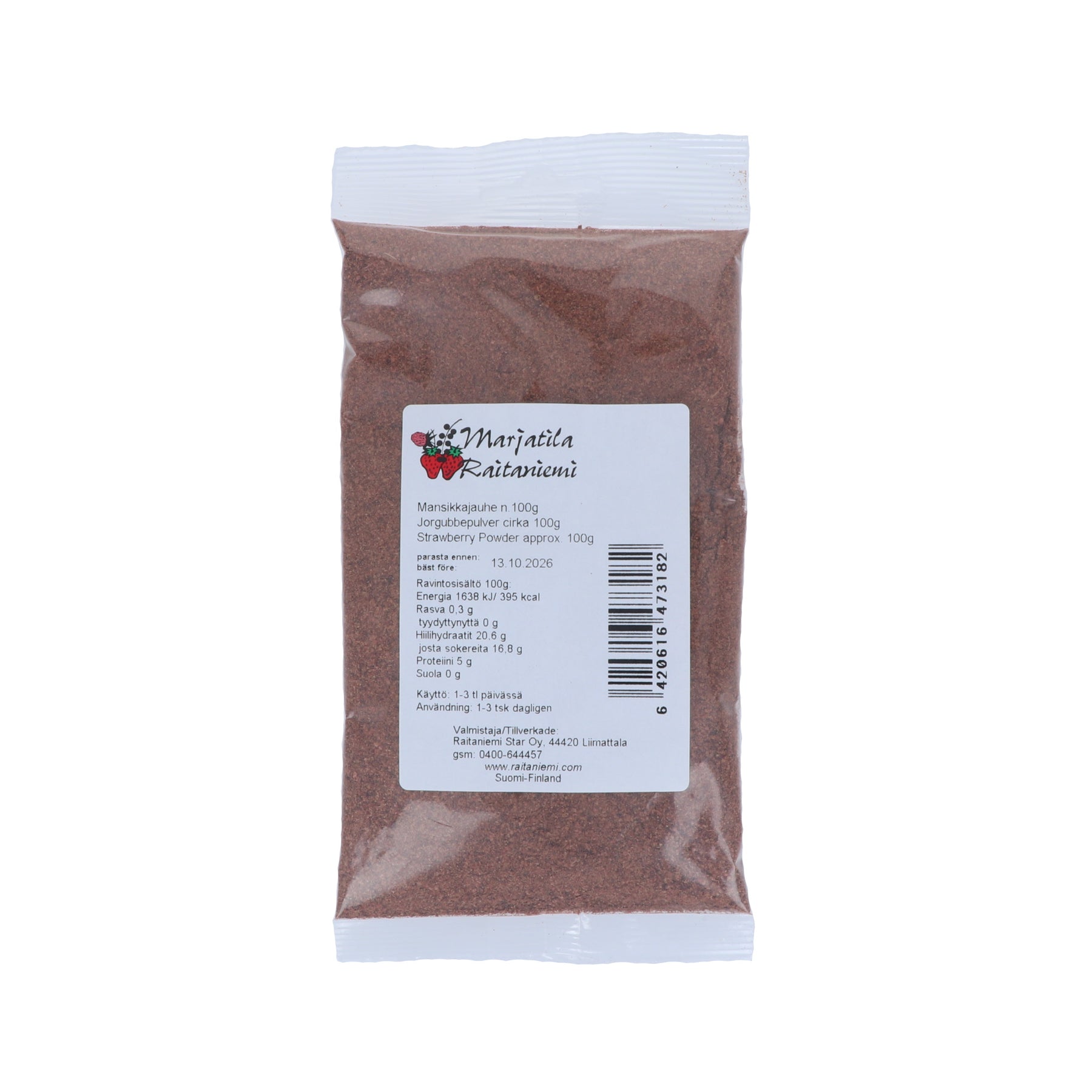 Kotimaisista, hellävaraisesti alhaisessa lämpötilassa kuivatuista mansikoista tehty jauhe, joka sisältää pelkkää mansikkaa. Jauheessa on mukana myös marjan terveellisen osa eli siemenet, jonka ravintoaineet elimistö pystyy näin hyödyntämään erinomaisesti. Mansikkajauhe on riittoisaa - yksi teelusikallinen jauhetta vastaa yli desilitrallista tuoreita marjoja. Nauti mansikkajauhetta viilin, jogurtin, smoothien tai puuron joukossa tai leivonnassa.