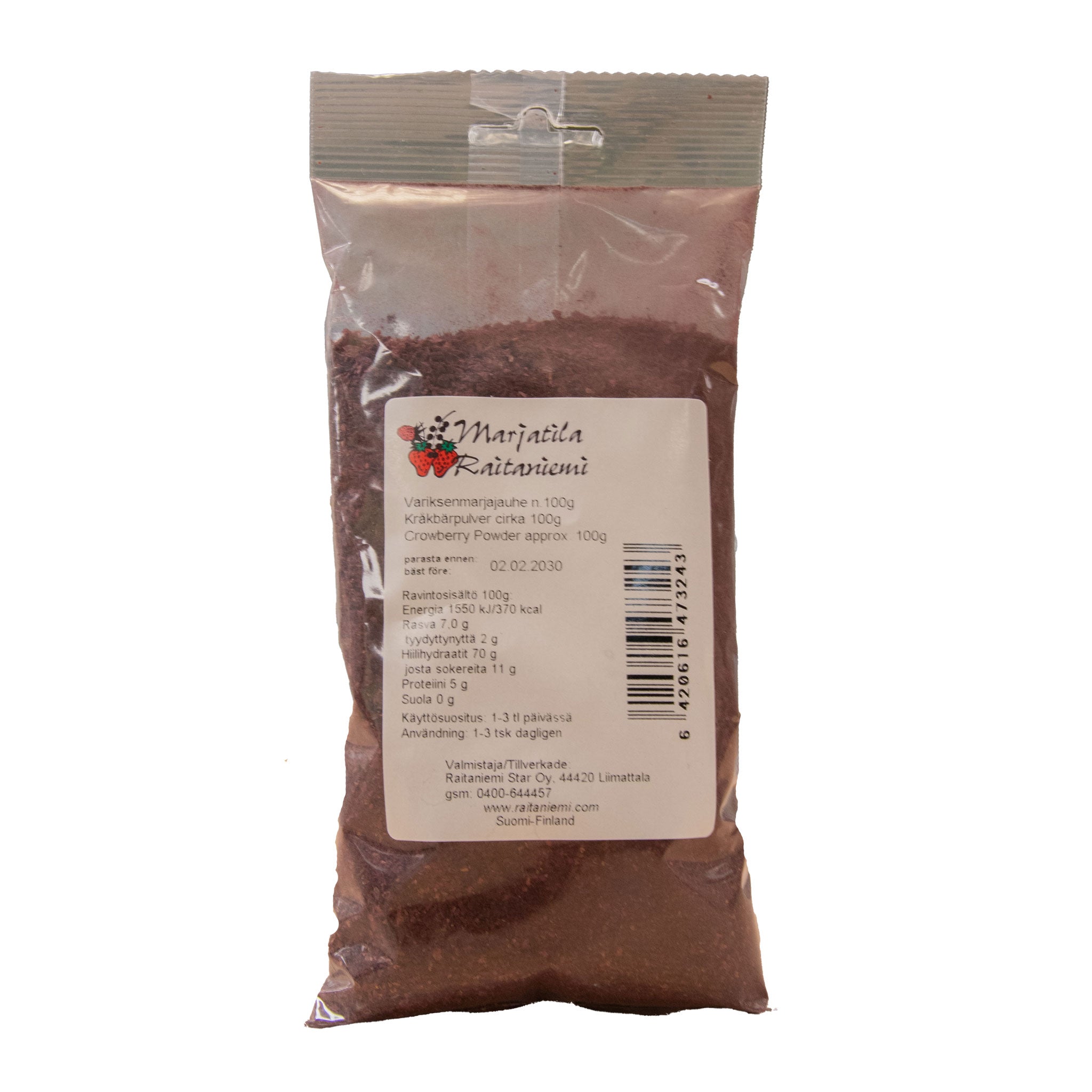 Raitaniemen variksenmarjajauhe on jauhettu puhtaasta luonnosta kerätystä kotimaisesta variksenmarjasta. Valmistettu kokonaisesta marjasta kuivaamalla ja jauhamalla. Marjajauhe ei sisällä lisä- eikä säilöntäaineita, vaan kyseessä on 100 % marjatuote.