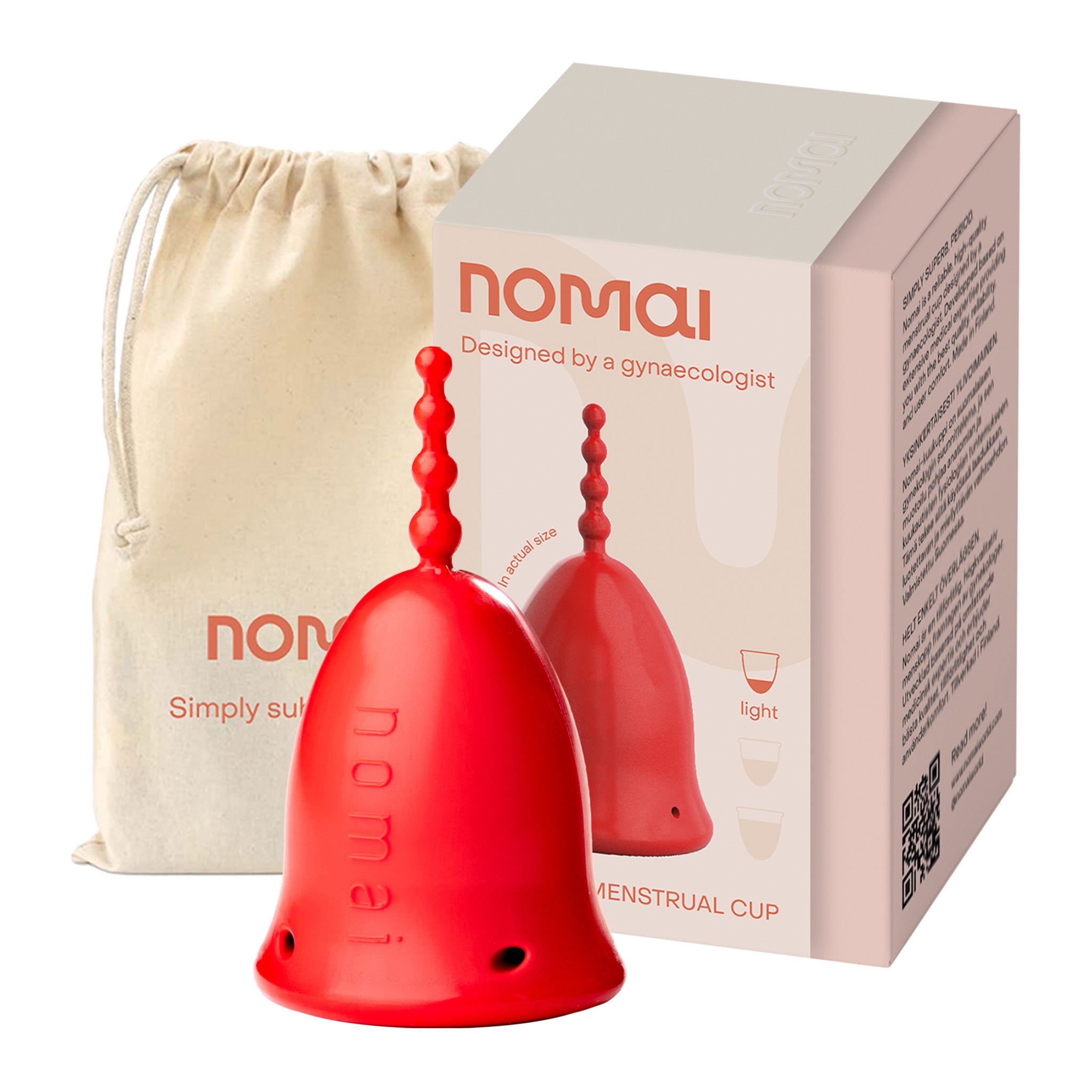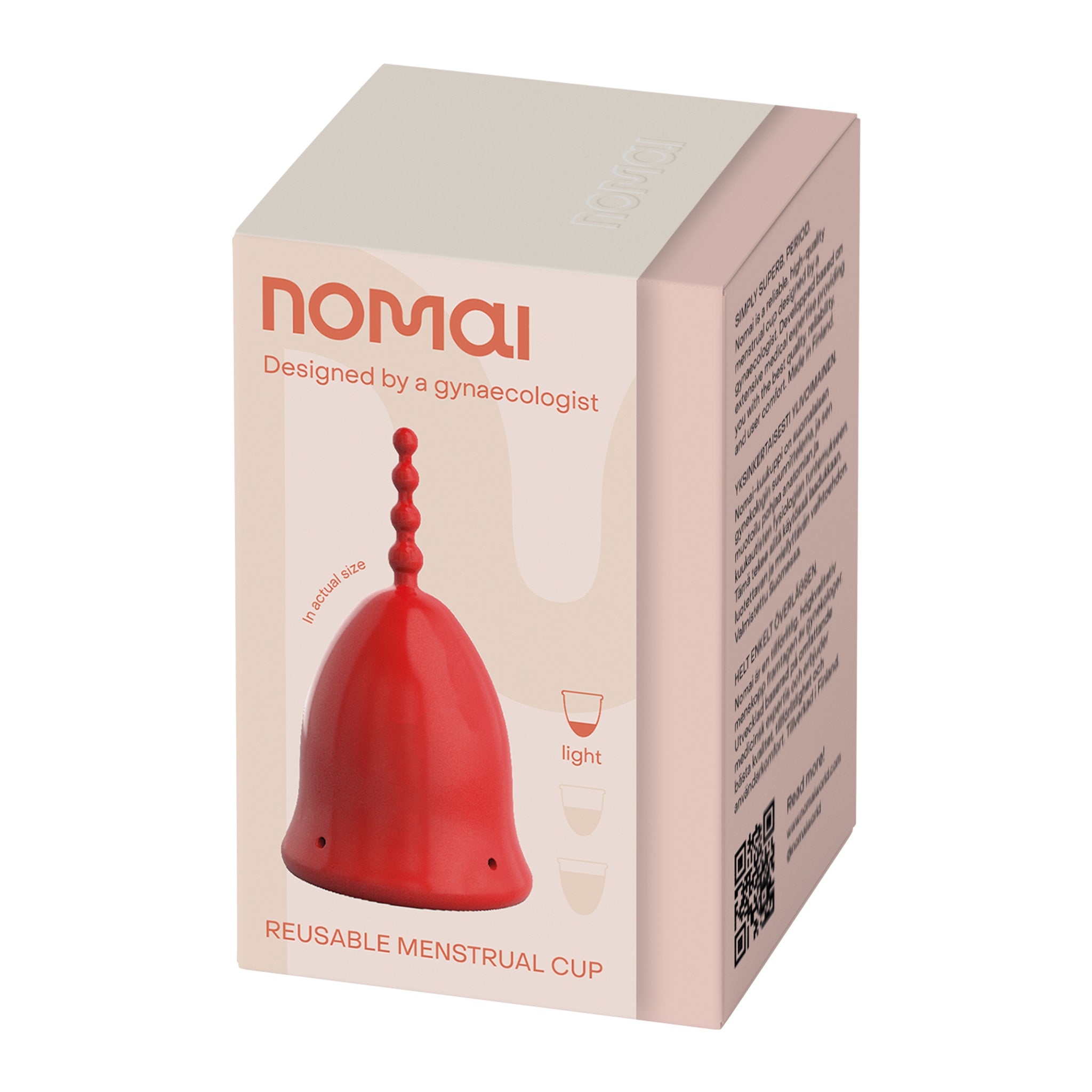 Punainen Nomai-kuukuppi light flow sopii nuorille naisille tai niukkaan vuotoon. Nomai-kuukuppi on suomalaisen gynekologin suunnittelema. Nomai-kuukuppien tuotekehitys perustuu vahvaan lääketieteelliseen osaamiseen. Se on kehitetty mukailemaan erilaisia anatomioita siksi se istuu täydellisesti sekä on käytössä varma ja huomaamaton. Nomai-kuukuppi sopii käyttöön kaikille, joilla on kuukautiset ja sitä voi käyttää jopa 12 h yhtäjaksoisesti.