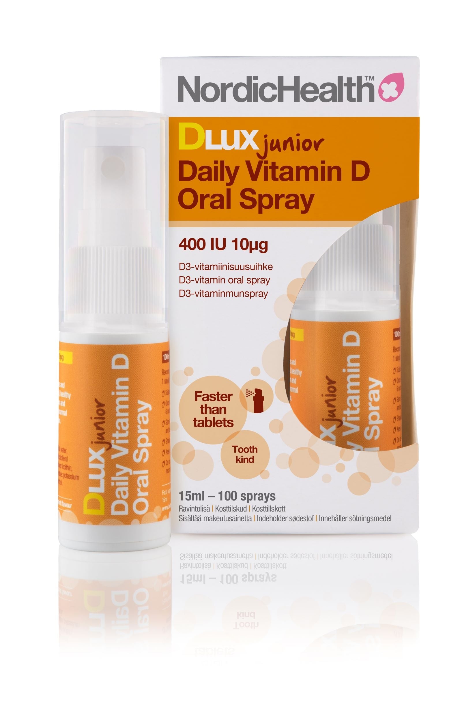 Dlux Junior D-vitamiinisuihke on helppo ja kätevä valmiste päivittäiseen käyttöön yli 3-vuotiaille lapsille. Se on raikkaan piparmintun makuinen. Tämä D-vitamiinisuihke on makeutettu xylitolilla, eikä siinä ole lainkaan mukana keinotekoisia lisäaineita. Nordic Health Dlux -vitamiinisuihkeiden imeytymisteho on testattu Cardiffin yliopiston imeytymistutkimuksissa.