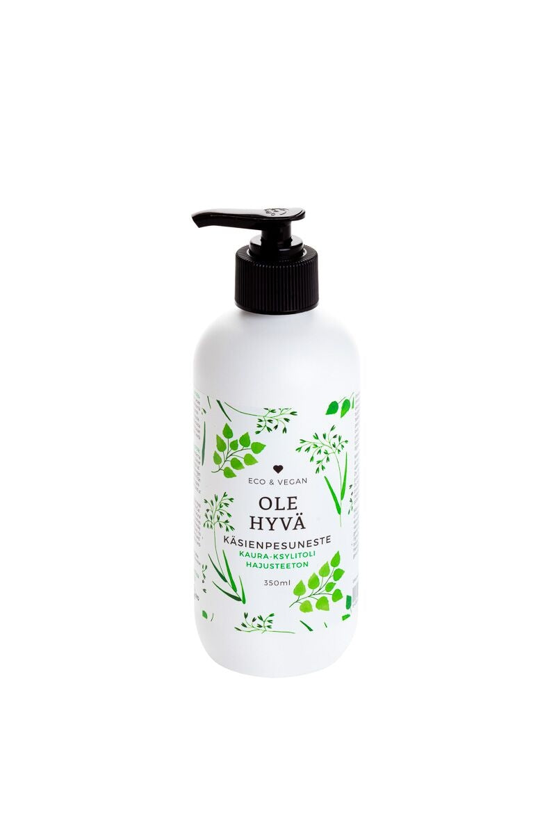 Hajusteeton Ole Hyvä -käsienpesuneste pesee kädet hellävaraisesti. Kaura-ksylitoliyhdistelmä vahvistaa ihon omaa kosteustasapainoa ja rauhoittaa käsien rasittunutta ihoa.