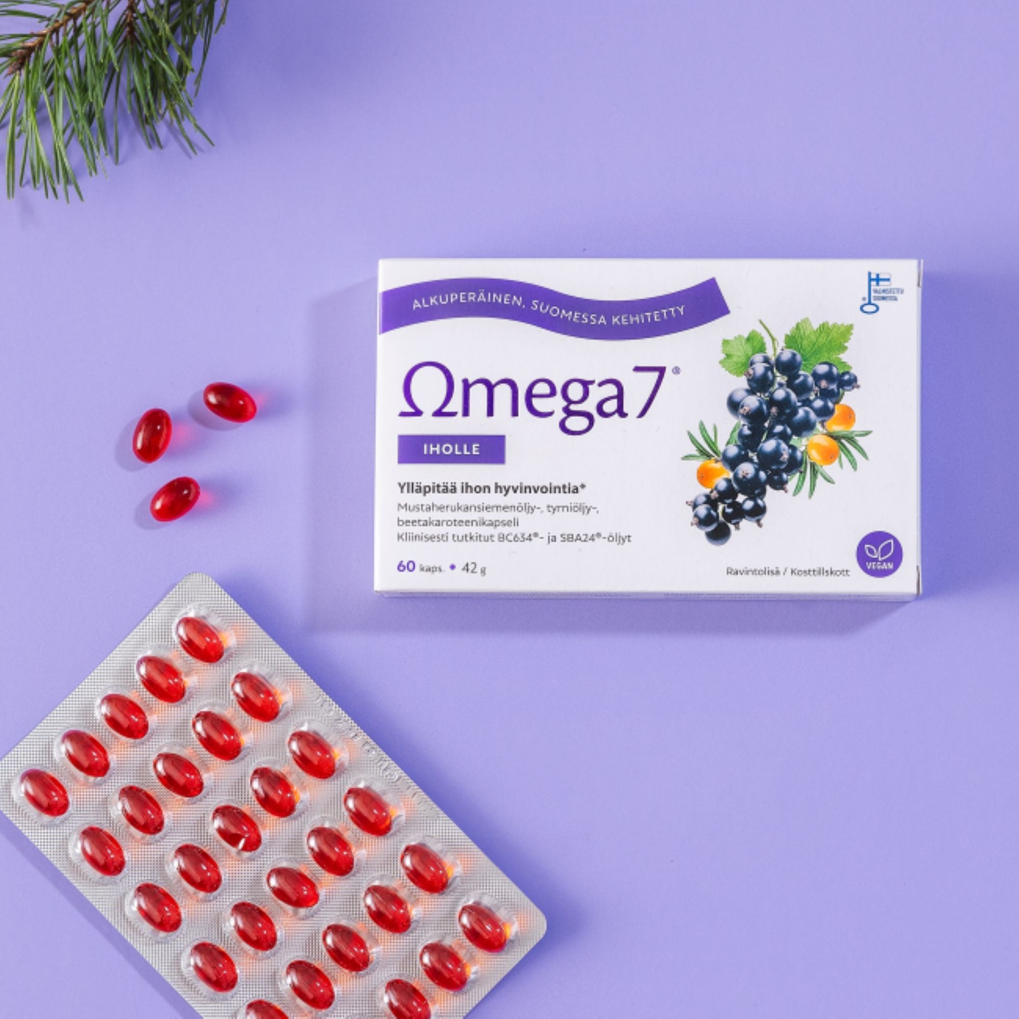 Alkuperäinen Omega7 BC634® + SBA24® sisältää tasapainoisen yhdistelmän omega-3, -6, -7 ja -9 -rasvahappoja, joista erityisen tärkeä ihon hyvinvoinnille on gammalinoleenihappo (GLA).