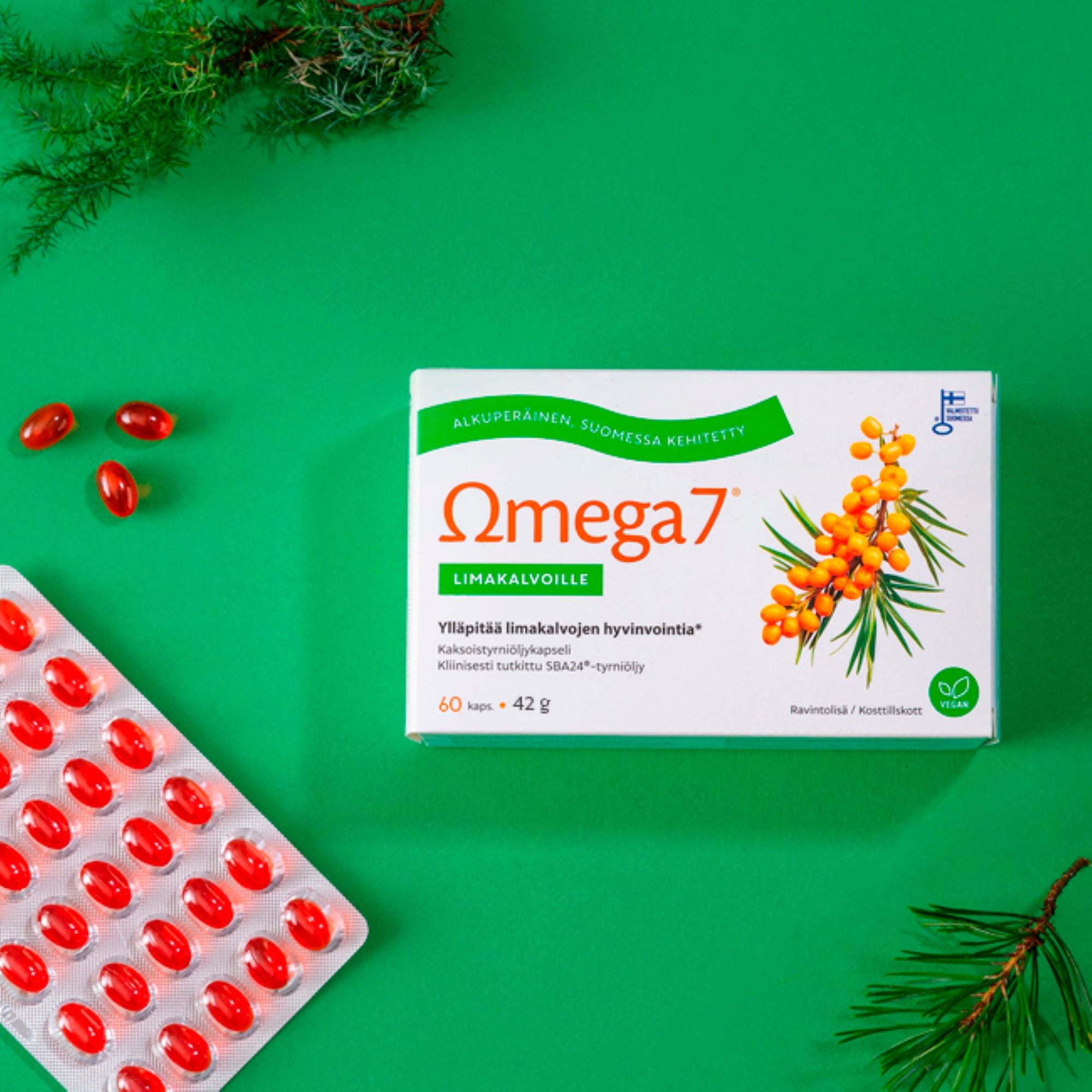 Suomen suosituin tyrniöljyvalmiste jo vuodesta 1997. Alkuperäinen, Suomessa kehitetty ja tutkittu Omega7 SBA24®-kaksoistyrniöljykapseli limakalvojen luonnolliseen kosteutukseen.