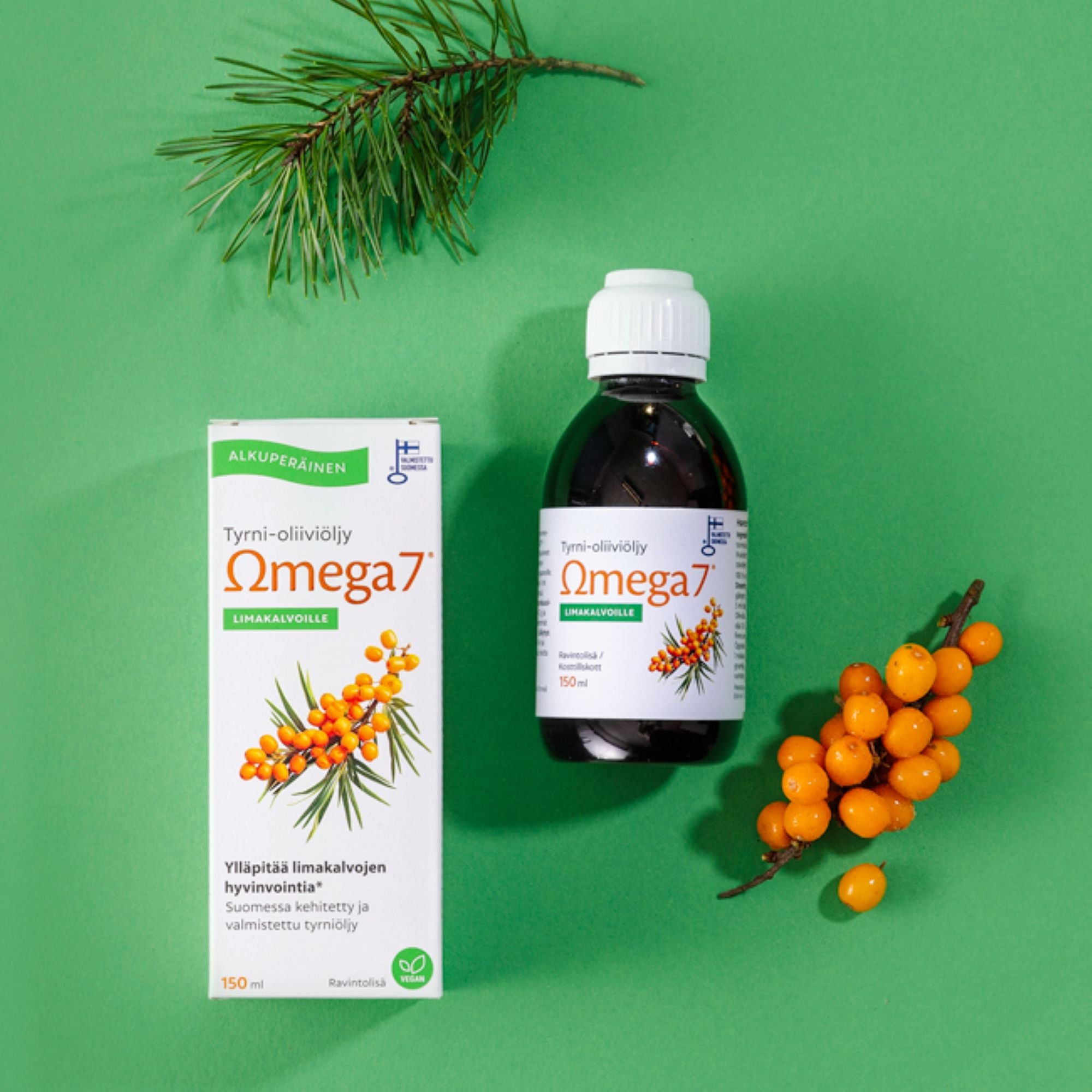 Omega7 SBA24®-kaksoistyrniöljy sisältää sekä tyrnin marja- että siemenöljyä, tarjoten iholle ja limakalvoille tärkeitä omega-3, -6, -7 ja -9 -rasvahappoja optimaalisessa suhteessa. Sen vakioidut A- ja E-vitamiinitasot tukevat tuotteen tehoa, ja keho muuntaa beetakaroteenin A-vitamiiniksi, joka edistää limakalvojen ja ihon hyvinvointia.