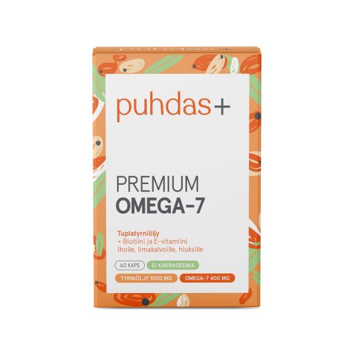 Puhdas+ Premium Omega-7 on vahva ja puhdas tuplatyrnivalmiste, joka sisältää tyrniöljyn arvokkaat ainesosat sekä siemenistä että hedelmästä.