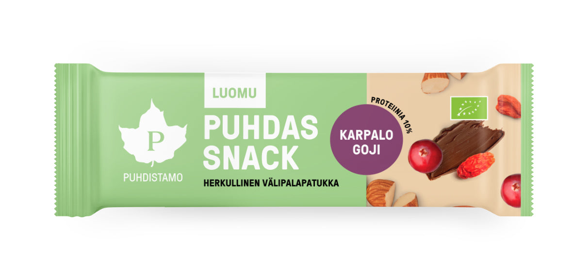 Puhdas Snack on laadukas välipalapatukka, joka on valmistettu ravitsevista luomusiemenistä ja -marjoista. Patukka on makeutettu luomulaatuisella agavesiirapilla, maustettu luomumarjoilla ja viimeistelty luomusuklaalla. Luonnollisen luomuinen ja herkullinen välipala koko perheelle.