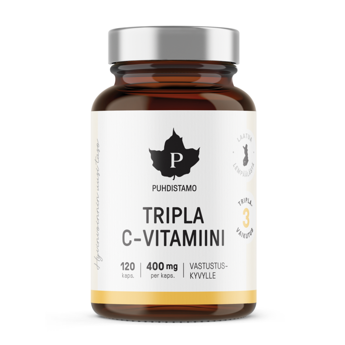 C-vitamiini jaksamisen tueksi jokaisena päivänä - nyt huippulaadukkassa muodossa! Puhdistamon Tripla C-vitamiini sisältää C-vitamiinia kolmessa muodossa ja sen lisäksi vieläpä camu camu -jauhetta, joka tuo kokonaisuuteen mukanaan tehokimaran arvokkaita kasviravinteita.