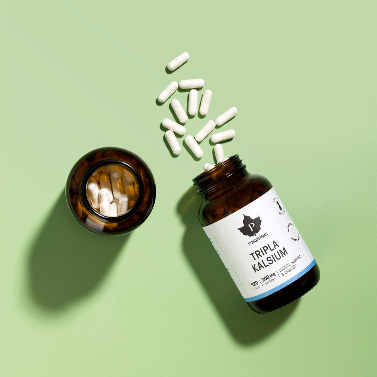 Puhdistamon Tripla Kalsium sisältää kolmea korkealaatuista kalsiumin muotoa luuston ja lihasten hyvinvoinnin tueksi.