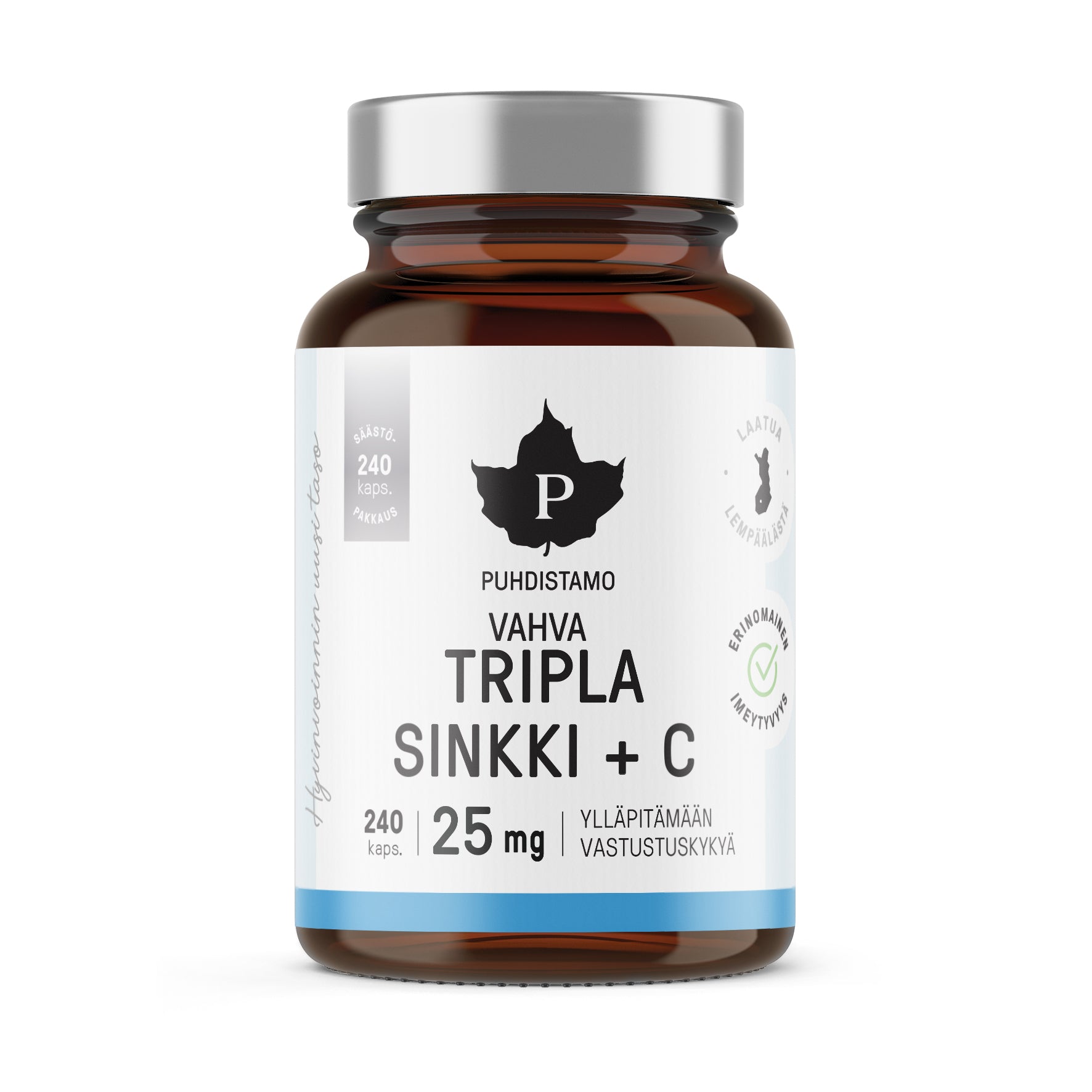 Puhdistamon Tripla Sinkki yhdistää kolme korkealaatuista sinkin muotoa sekä C- ja B6-vitamiinit, jotka tukevat immuunijärjestelmääsi, edistävät ihon, hiusten ja luuston hyvinvointia sekä rasva-aineenvaihduntaa. Säästöpakkauksessa!