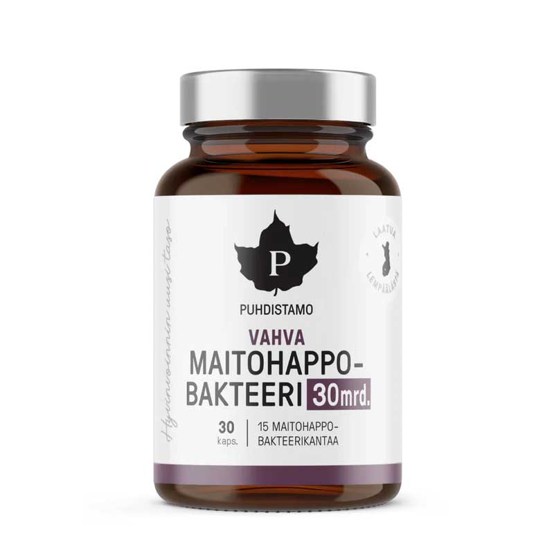 Puhdistamon Vahva Maitohappobakteerissa yksi kapseli sisältää peräti 30 miljardia maitohappobakteeria. Maitohappobakteerivalmisteessa vaikuttaa 15 tunnettua bakteerikantaa, joten se on todella monipuolinen. Tuotteeseen on myös lisätty juuri oikea määrä inuliinia ja fruktooligosakkarideja, joita maitohappobakteerit tarvitsevat pysyäkseen elossa.
