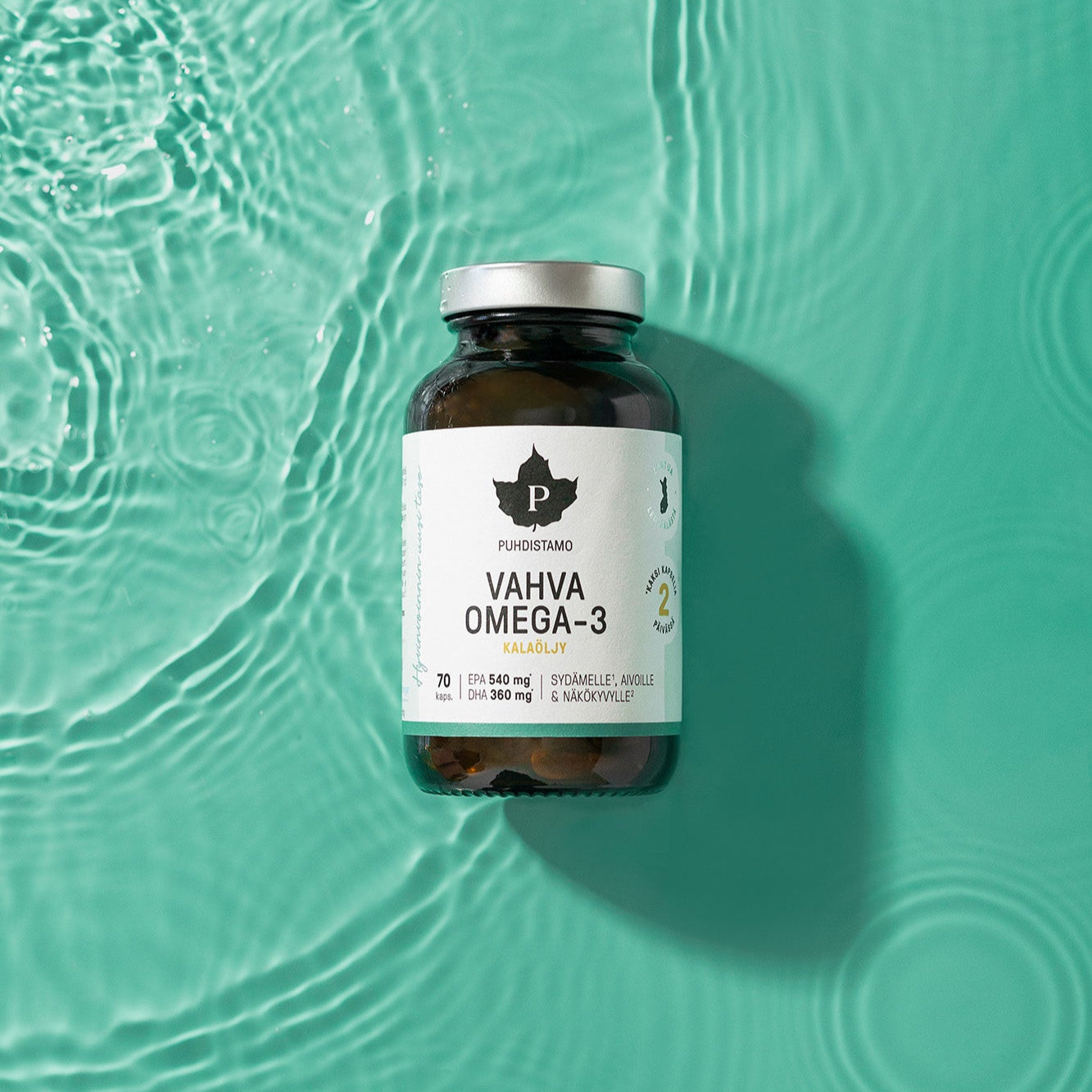 Puhdistamon Golden Omega® -kalaöljy sisältää vahvaa triglyseridimuotoista Omega-3:a, joka tarjoaa runsaasti tärkeitä rasvahappoja: EPA (540 mg) ja DHA (360 mg). Nämä rasvahapot edistävät sydämen normaalia toimintaa, ja DHA tukee myös aivotoimintaa ja näkökyvyn ylläpitämistä normaalina.
