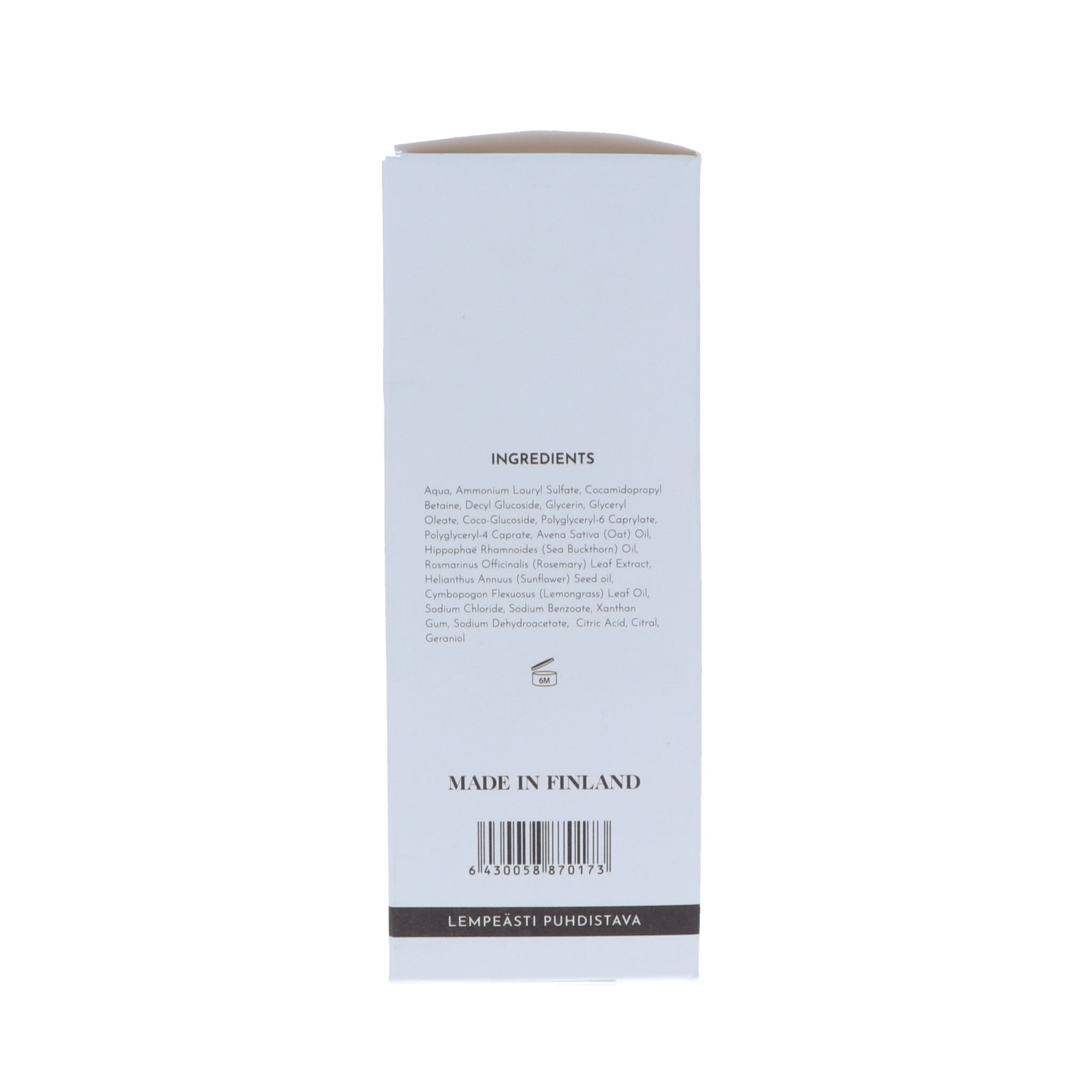 Vesi, ammoniumlauryylisulfaatti, Kokamidopropyylibetaiini, Dekyyliglukosidi, glyseriini, glyseryylioleaatti, Kookosglukosidi, Polyglyseryyli-6 Kaprylaatti, Polyglyseryyli-4 Kapraatti, Kauraöljy, tyrniöljy, Rosmariinin eteerinen öljy, auringonkukan siemenöljy, sitruunaruohon eteerinen öljy, Natriumkloridi, Natriumbentsoaatti, Ksantaanikumi, Natriumdehydroasetaatti, sitruunahappo, sitraali, Geranioli
