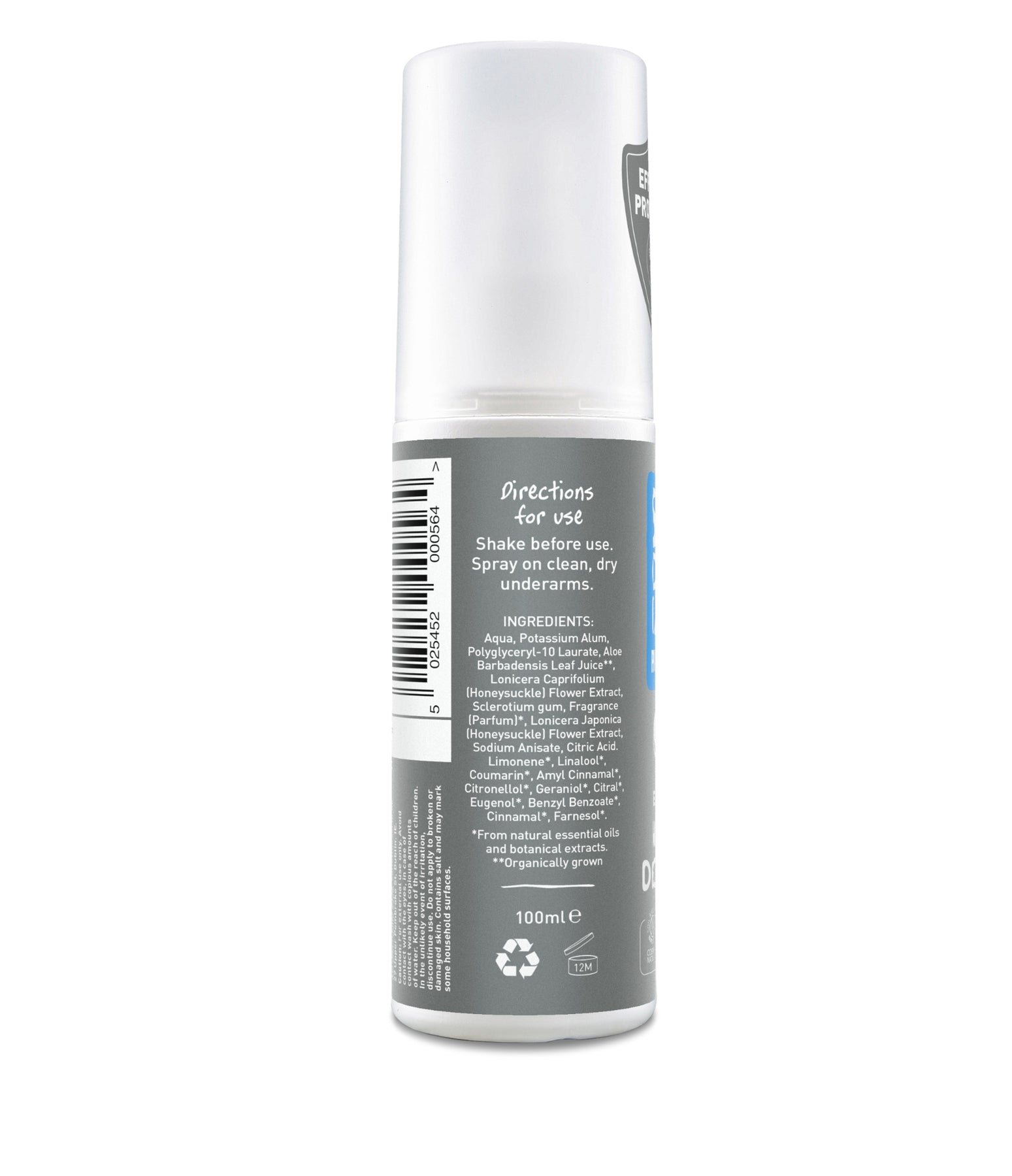 Aqua, Potassium Alum, Triethyl Citrate, Sodium Lactate, Magnesium Chloride, Decyl Glucoside, *Parfum, Aloe Barbadensis Leaf Juice Powder**, Rosmarinus Officinalis (Rosemary) Leaf Extract, Helianthus Annuus (Sunflower) Seed Oil, Glycerin, Magnesium Hydroxide, Xanthan Gum, Magnesium Carbonate Hydroxide, Phytic Acid, Sodium Anisate, *Limonene, *Linalool, *Coumarin, *Amyl Cinnamal. *From natural botanical extracts and essential oils. **Organically grown.