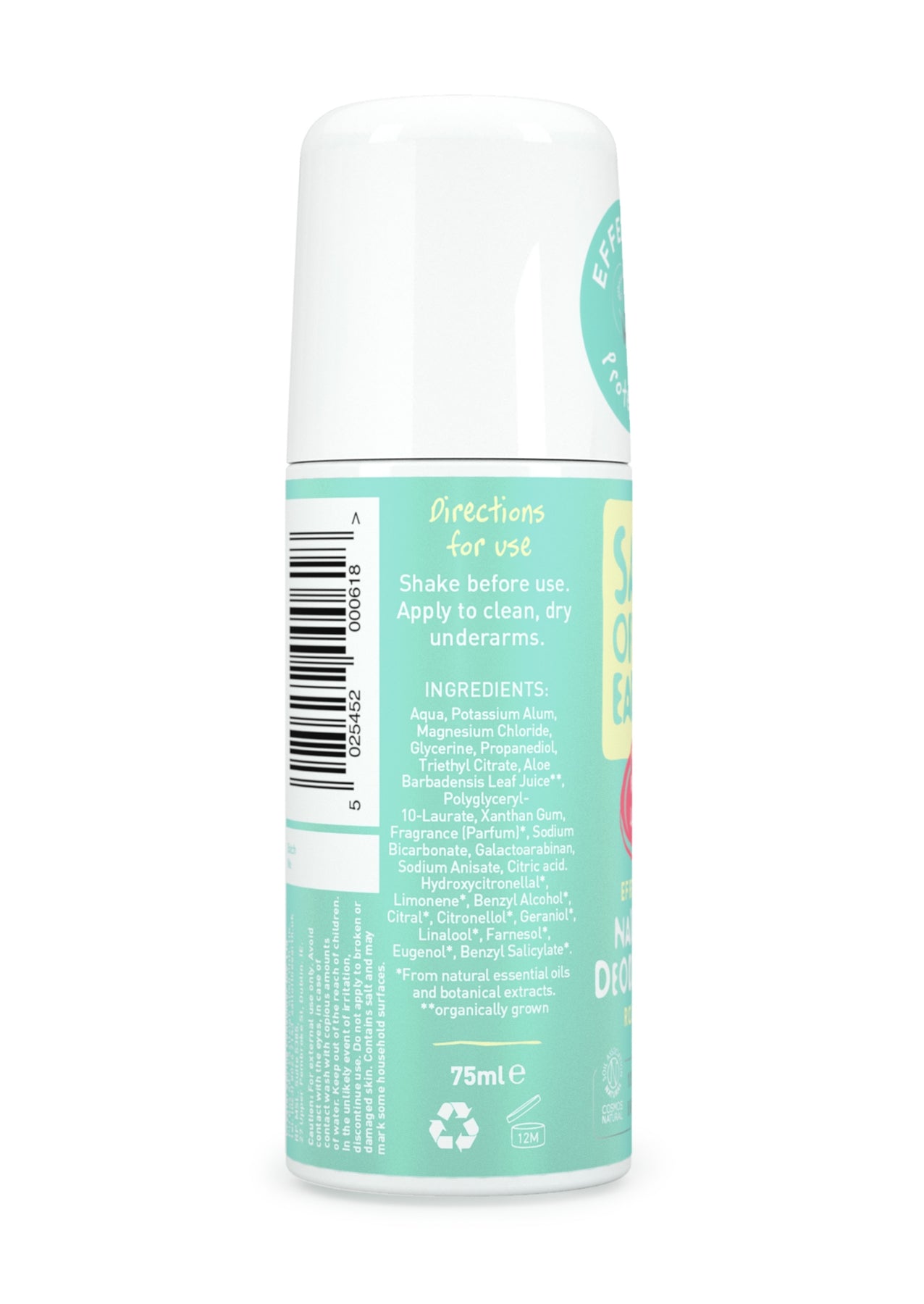 Aqua, Potassium Alum, Magnesium Chloride, Glycerine, Propanediol, Triethyl Citrate, Aloe Barbadensis Leaf Juice**, Polyglyceryl-10-Laurate, Xanthan Gum, Fragrance (Parfum)*, Sodium Bicarbonate, Galactoarabinan, Sodium Anisate, Citric acid. Hydroxycitronellal*, Limonene*, Benzyl Alcohol*, Citral*, Citronellol*, Geraniol*, Linalool*, Farnesol*, Eugenol*, Benzyl Salicylate*. *From natural essential oils and botanical extracts. **Organically grown.