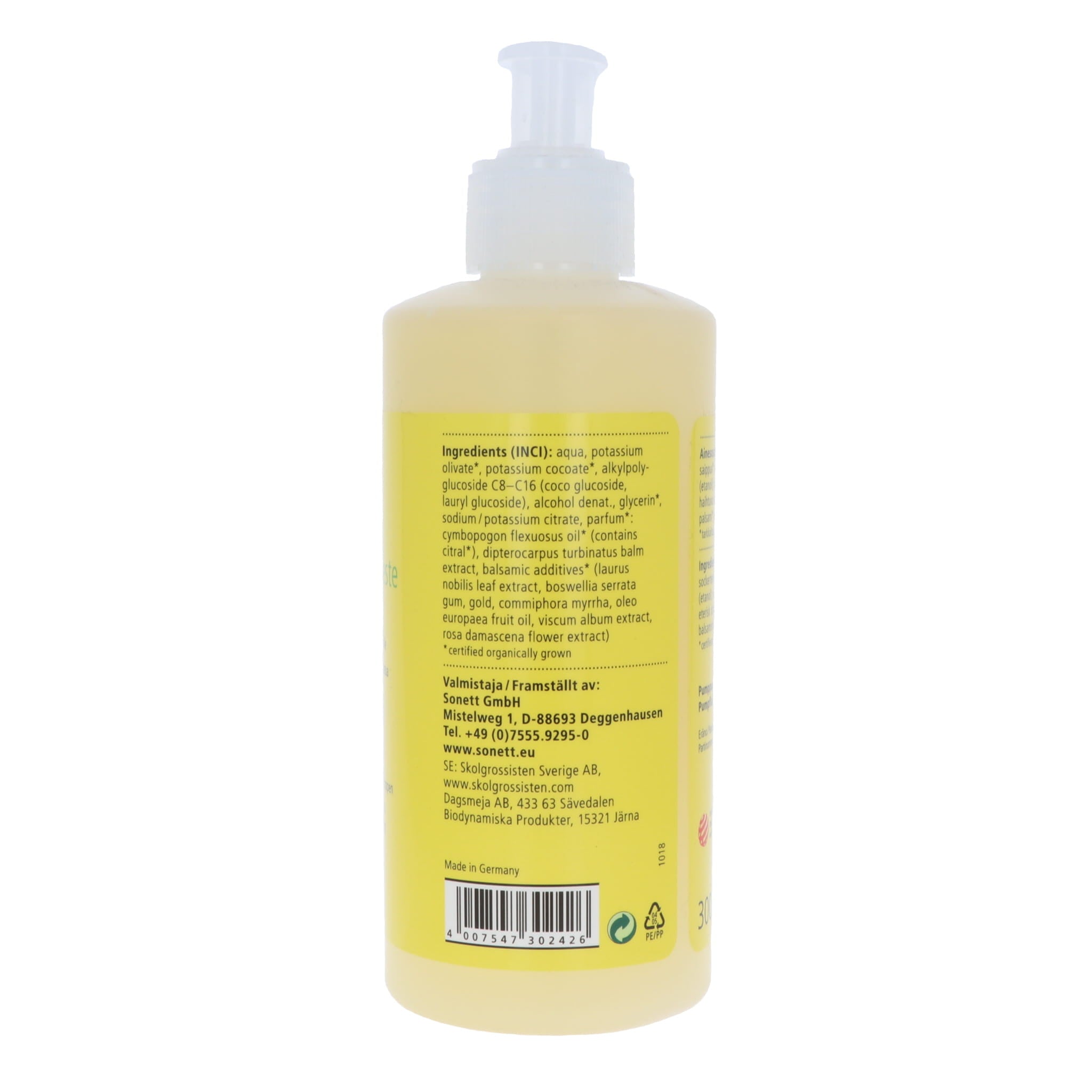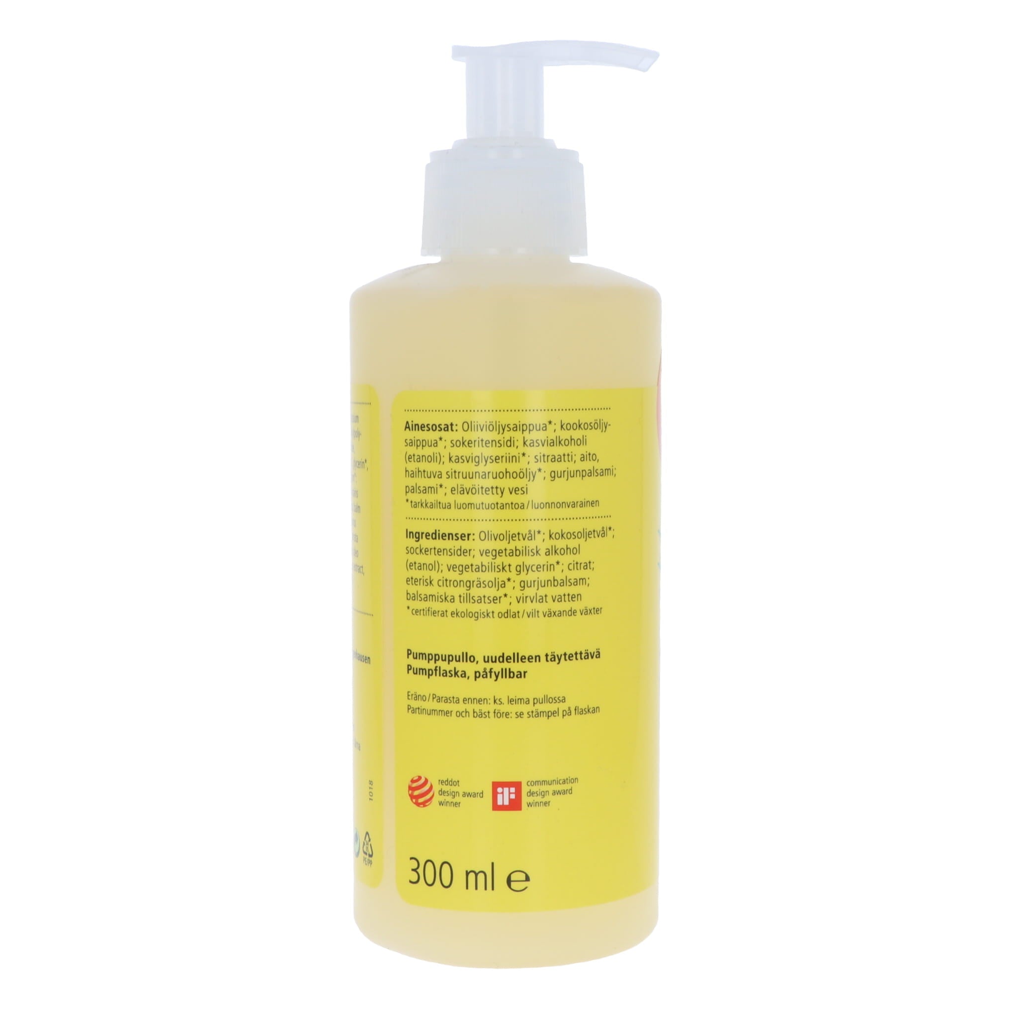 Oliiviöljyn* ja kookosöljyn* saippua, pinta-aktiivinen sokeripitoisuus, kasvisalkoholia (etanolia), kasviglyseriiniä *, sitraattia, välttämätöntä sitruunaruohoöljyä * (sisältää sitraalia *), guru-balsamia, balsamilisäaineita *, vettä (* sertifioidut luonnonmukaisesti kasvatetut / villit kasvukasvit)