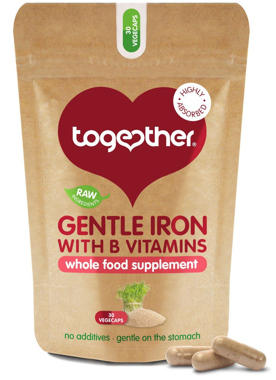 Gentle Iron Complex sisältää myös keholle elintärkeitä B6 - ja B12- vitamiineja sekä luonnollisessa muodossa olevaa folaattia. Rauta imeytyy usein parhaiten tyhjään vatsaan. Useimmat perinteiset rautalisät voivat aiheuttaa vatsakramppeja, pahoinvointia ja ripulia tyhjään vatsaan otettuna. Together Iron Complexissa käytetty rauta on täysravintomuodossa, joten se on turvallista ottaa tarvittaessa myös tyhjään vatsaan.