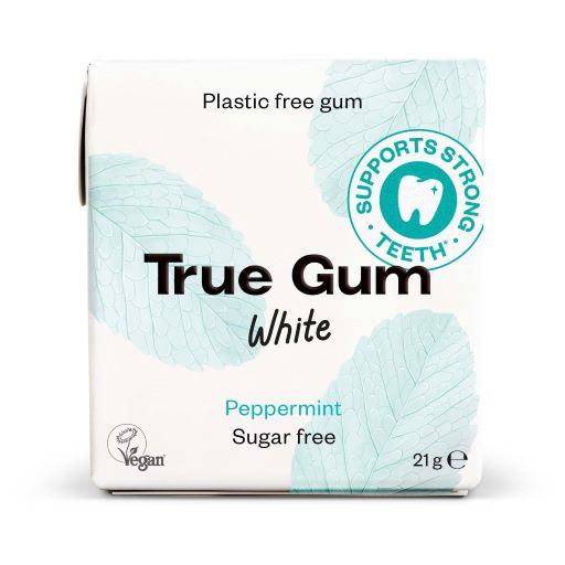 True Gum White piparminttupurkka on monella tapaa parempi purukumi, sillä se ei sisällä lainkaan muovia, on vegaaninen ja valmistettu täysin luonnollisista aineksista. Piparminttu maistuu mukavan makealle ja raikastaa hetkessä.