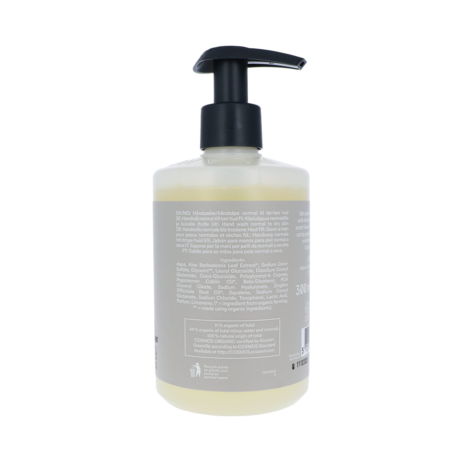 Ingredients: Aqua, Aloe Barbadensis Leaf Extract*, Sodium Coco-Sulfate, Glycerin**, Lauryl Glucoside, Disodium Cocoyl Glutamate, Coco-Glucoside, Polyglyceryl-4 Caprate, Pogostemon Cablin Oil*, Beta-Sitosterol, PCA Glyceryl Oleate, Sodium Hyaluronate, Zingiber Officinale Root Oil*, Squalene, Sodium Cocoyl Glutamate, Sodium Chloride, Tocopherol, Lactic Acid, Parfum, Limonene. (* = ingredient from organic farming, ** = made using organic ingredients). 11 % organic of total. 44 % organic of total minus water and minerals. 100 % natural origin of total. COSMOS ORGANIC certified by Ecocert Greenlife according to COSMOS Standard.