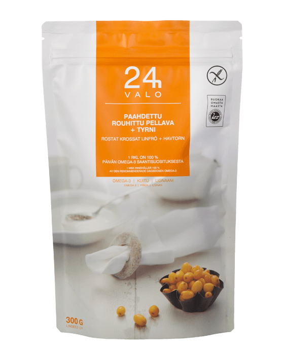 "Ostin alun perin Valo24h –pellavarouhe+tyrnirouheen auttamaan vatsan toiminnassa. Nyt olen huomannut että pellavan sisältämä omega-3 on tehnyt talvi-ihostani pehmeämmän, ja hiuksistani kosteutetun tuntuiset! Luottotuotteeni, johon palaan aina uudestaan ja uudestaan!"