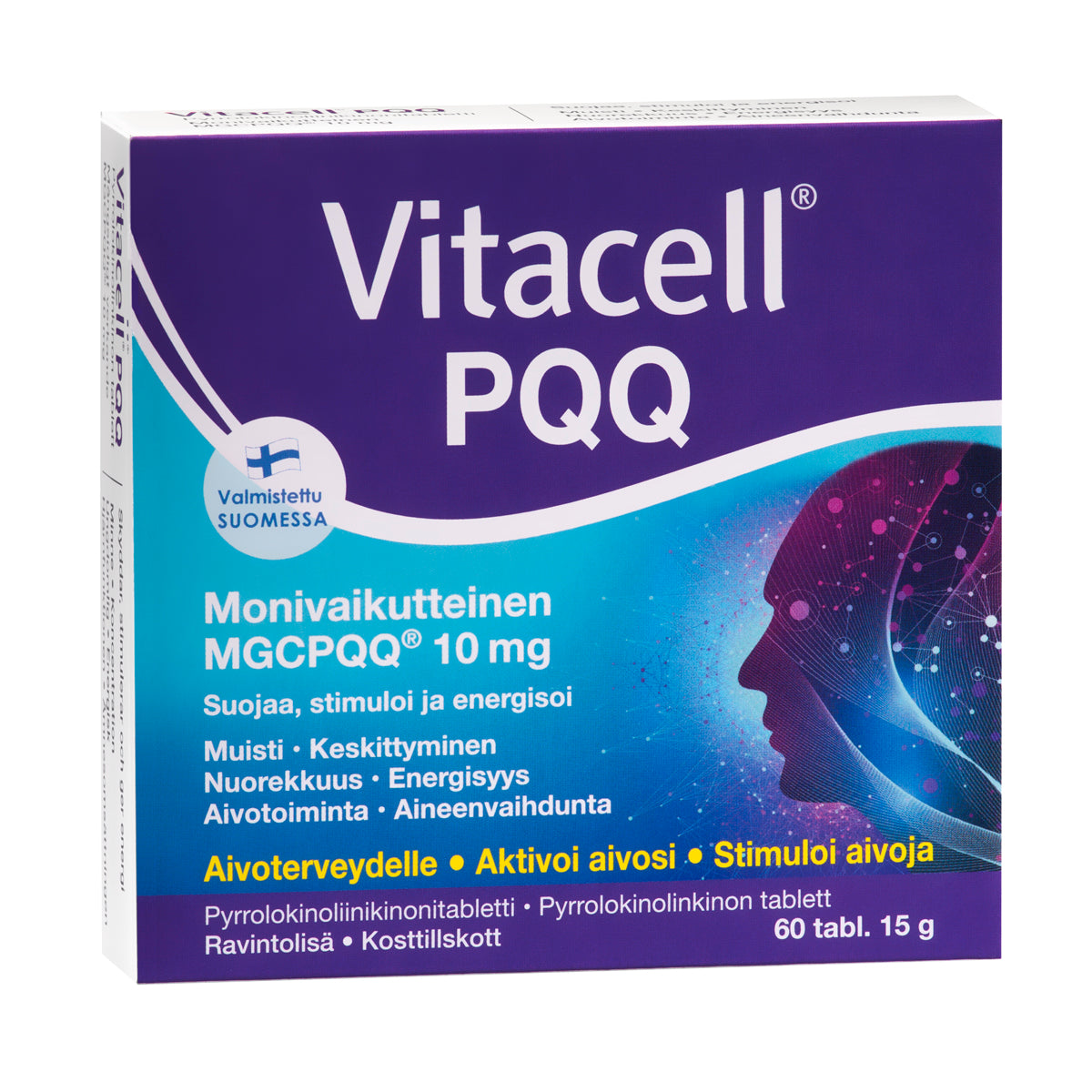 Vitacell® PQQ -valmisteessa vaikuttaa MGCPQQ® (eli pyrrolokinoliinikinoni). Vitamiinin kaltainen PQQ on erityisen tärkeä hermosoluille ja tukee mitokondrioiden toimintaa koko kehossa. Mitokondriot puolestaan vastaavat solujen energia-aineenvaihdunnasta eli soluhengityksestä. Soluhengityksen avulla solut vapauttavat ravinnon sisältämää energiaa käyttöönsä.