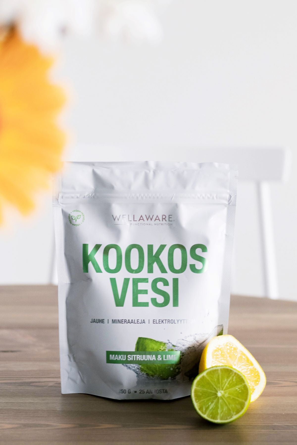 Kookosvesijauhe kulkee näppärästi mukana - valmiista juomasta saat elektrolyyttejä, C-vitamiinia ja rautaa aivan kuin tavallisesta kookosvedestä. Sitruksinen maku raikastaa mielen ja kielen!