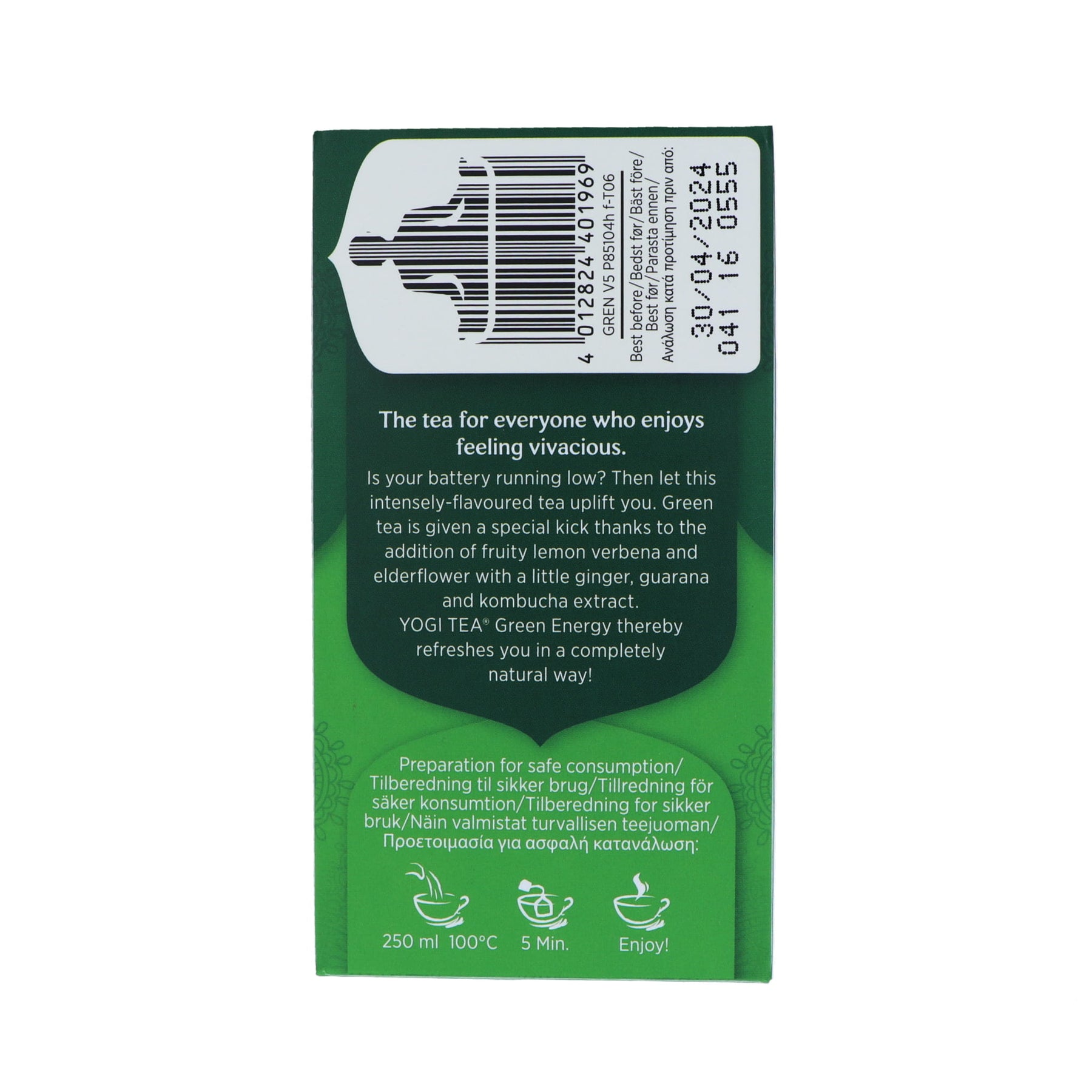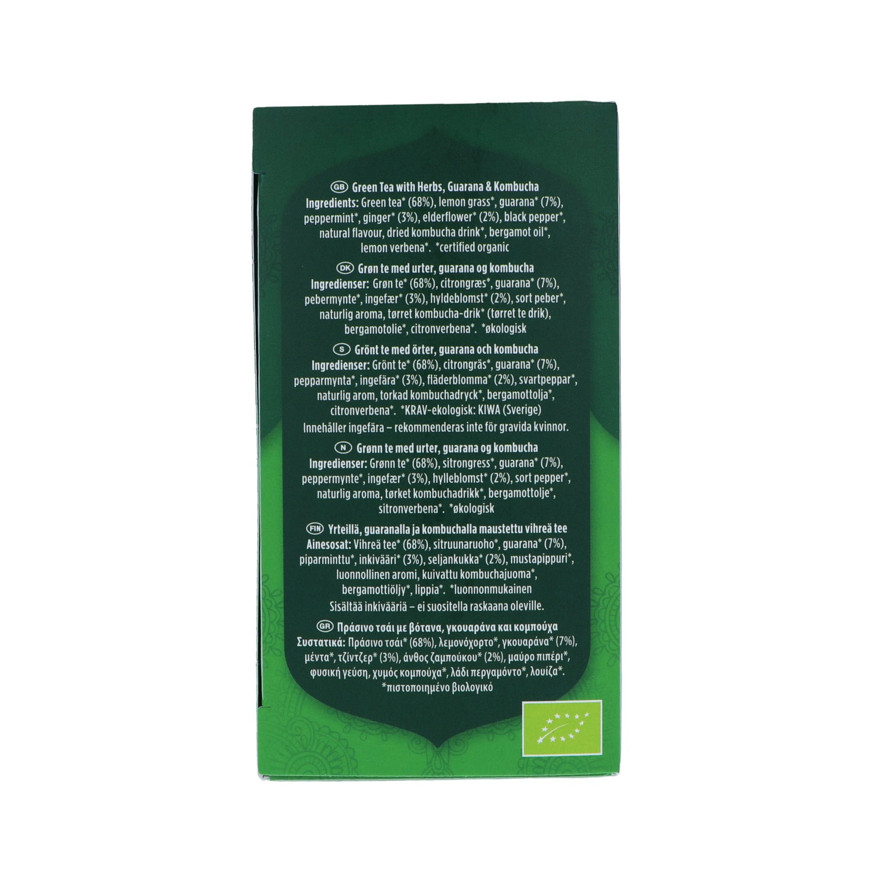 Ainesosat: Vihreä tee* (68%), sitruunaruoho*, guarana* (7%), piparminttu*, inkivääri*, luonnollinen aromi, seljankukka*, mustapippuri*, kombucha*, lippia*. *=luomulaatua.